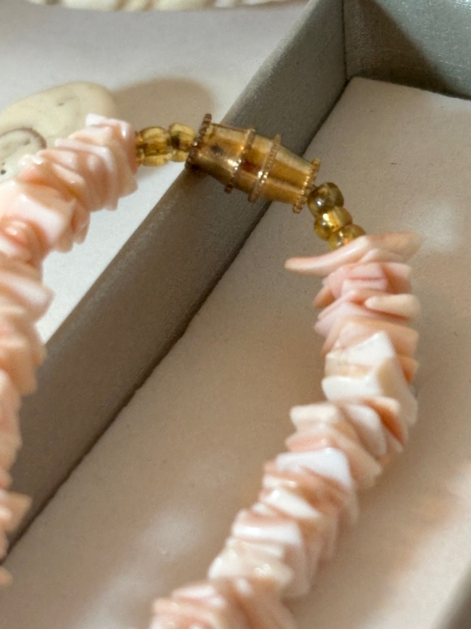 This elegant vintage necklace features a soft pink hue and a gentle, shimmering luster that gives the piece a feminine and timeless appeal. The evenly arranged elements create a harmonious overall look and emphasize the necklace’s classic character.