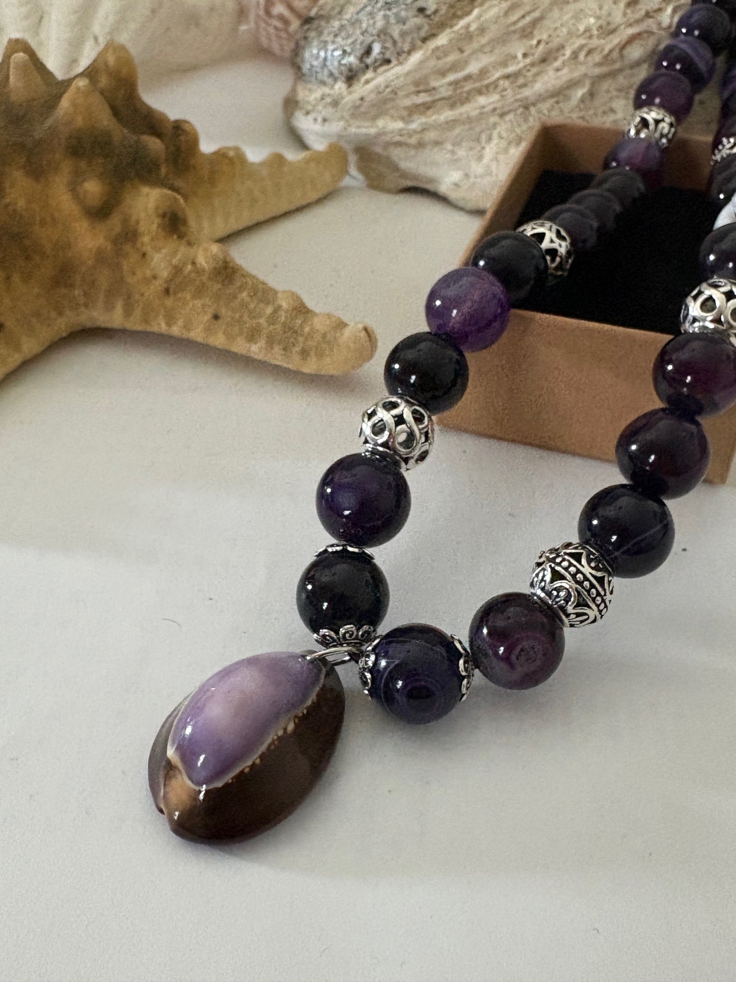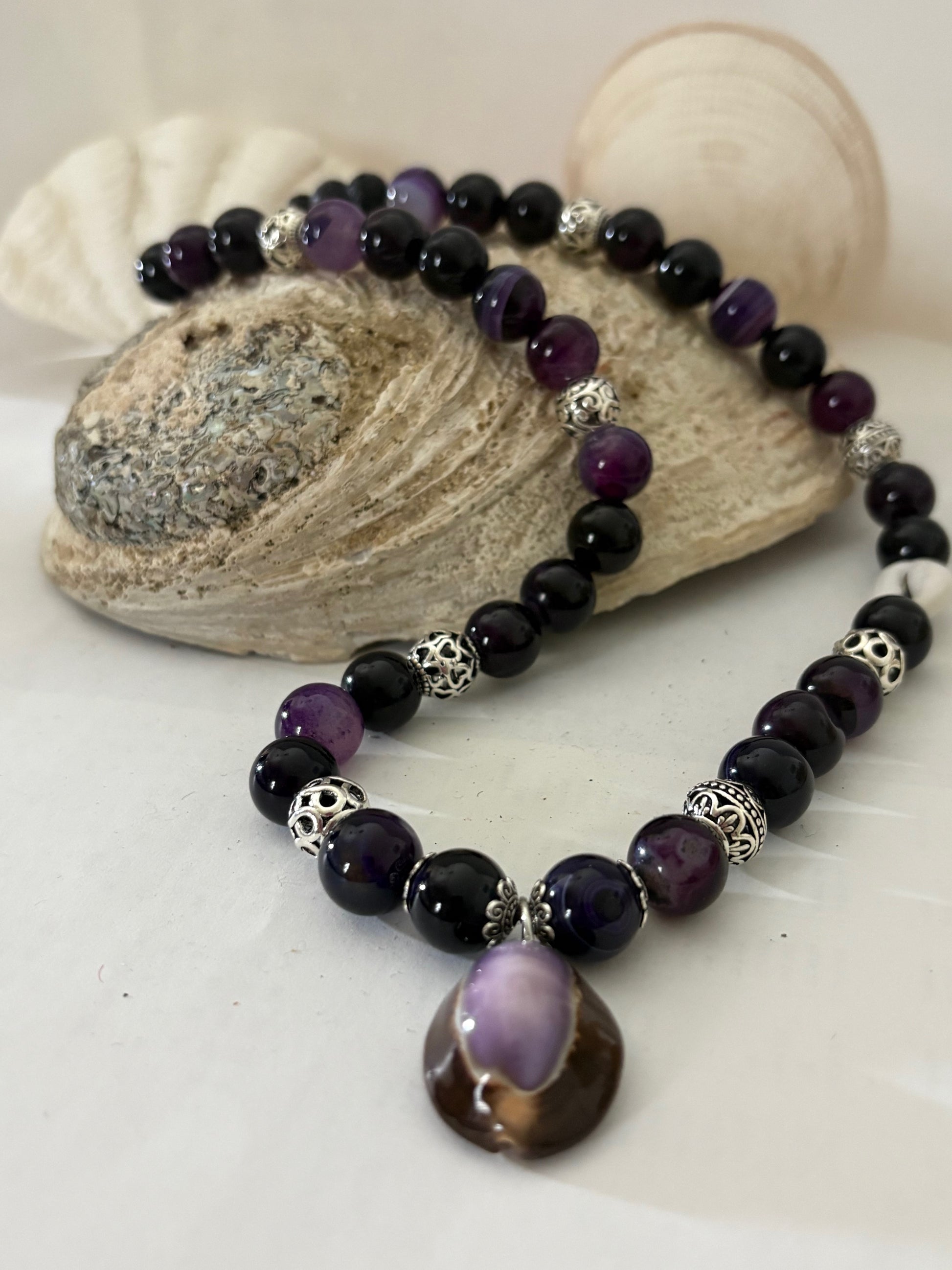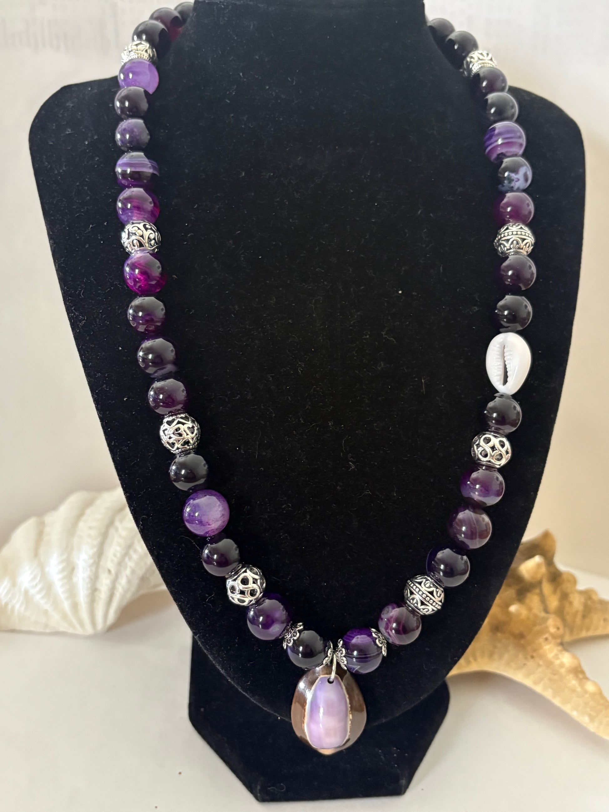 Einzigartige, handgefertigte Boho-Kette aus violetten Achatperlen mit Lavaperlen im Verschlussbereich, dekorativen Metall-Zwischenelementen und Muscheldetails. Ausdrucksstarkes Unikat mit natürlicher Eleganz.