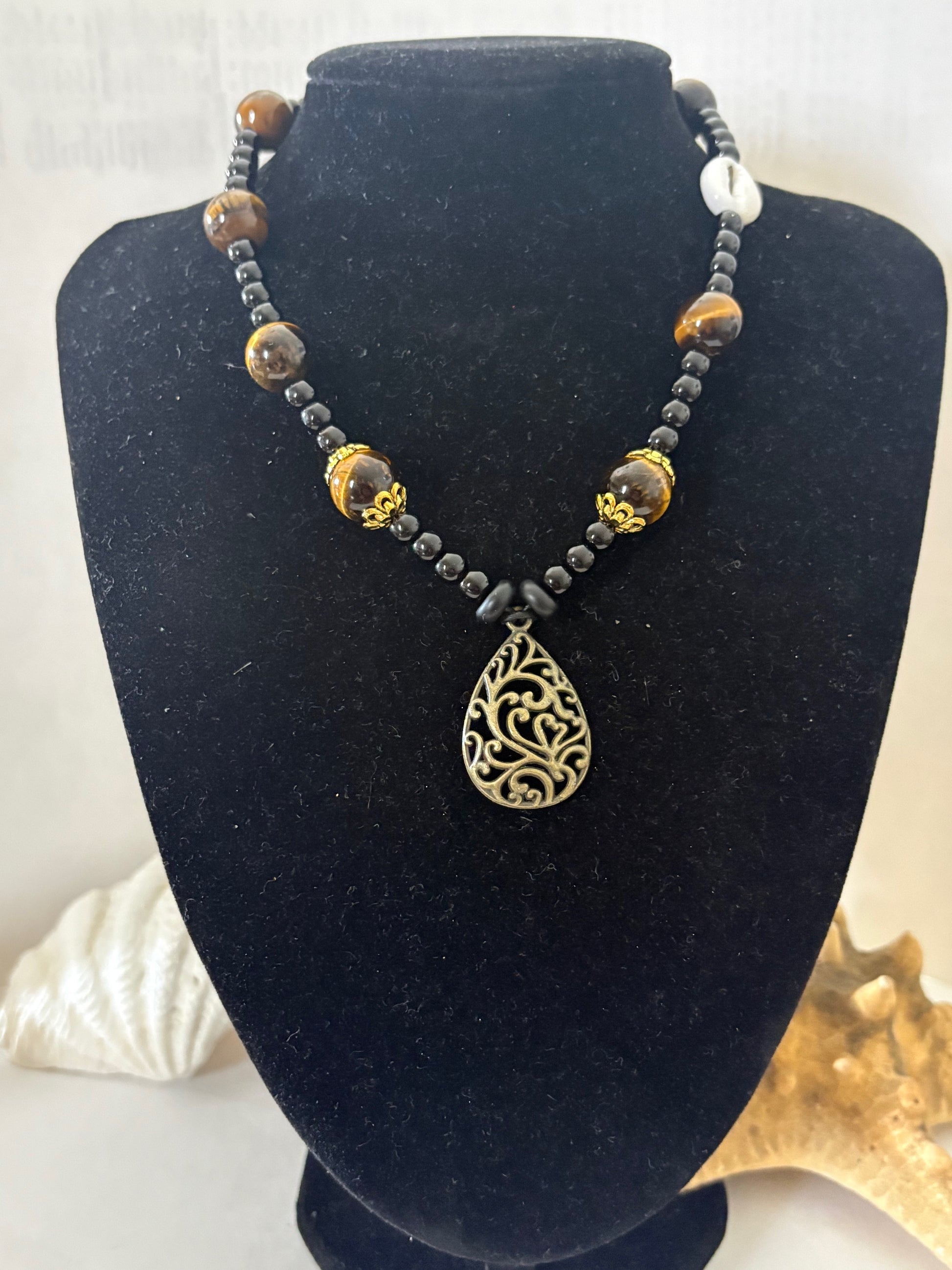 Kompakte, handgefertigte Tigerauge-Kette mit schwarzen Acrylperlen, Metall-Zwischenelementen, Muscheldetail und ornamentalem Anhänger. Halsnahes Boho-Statement.