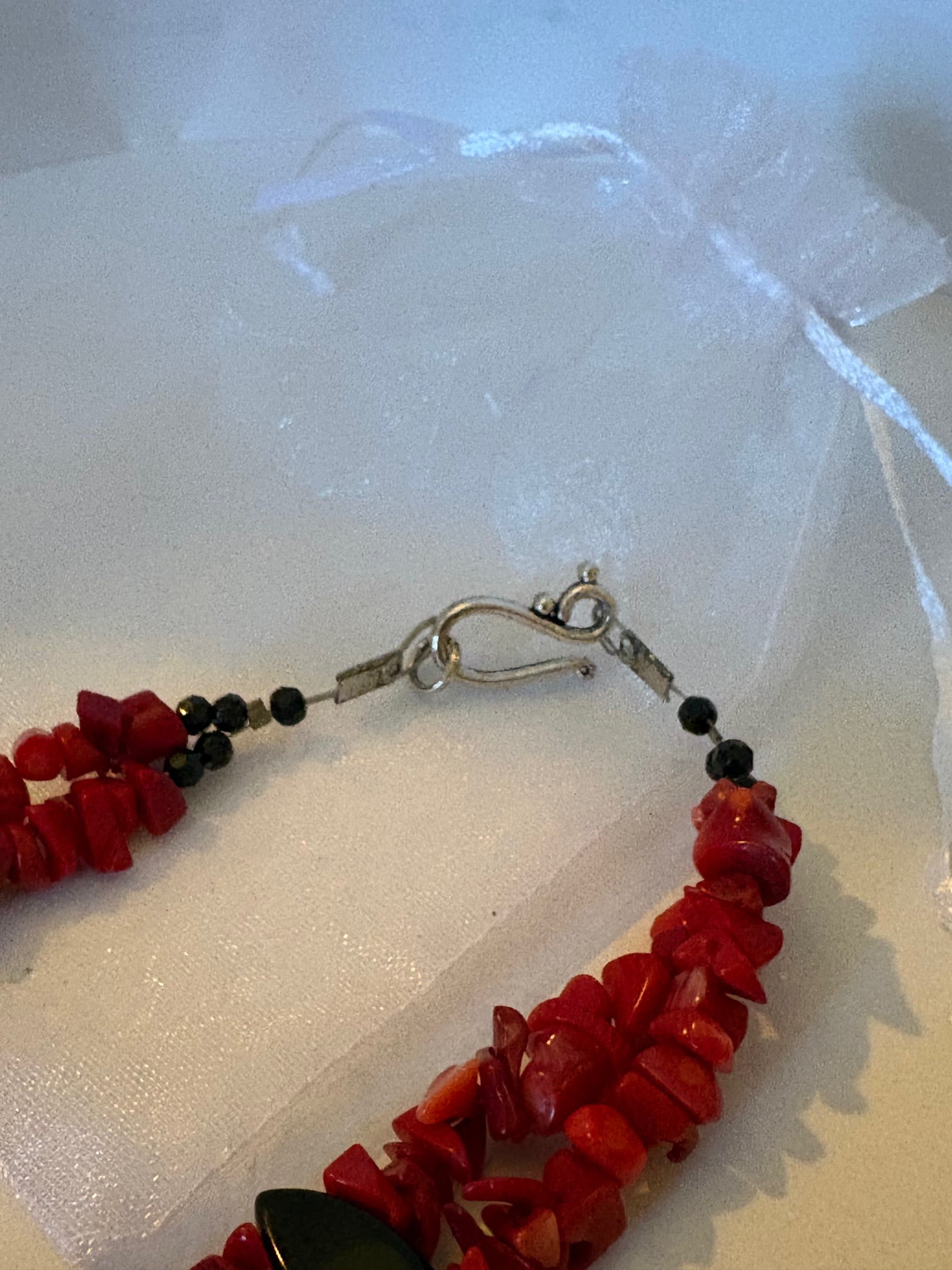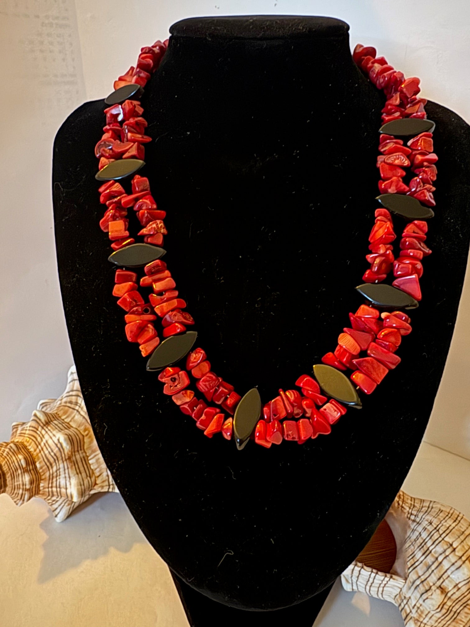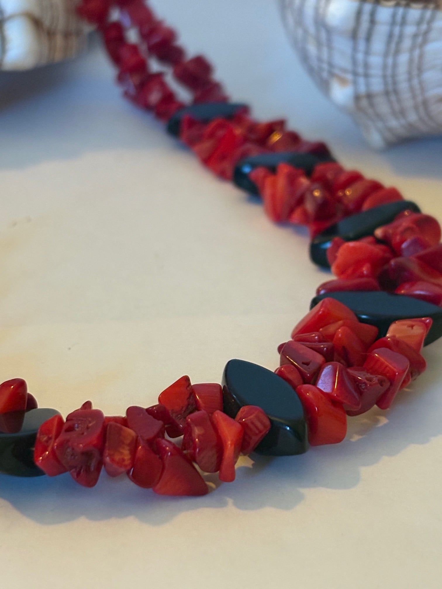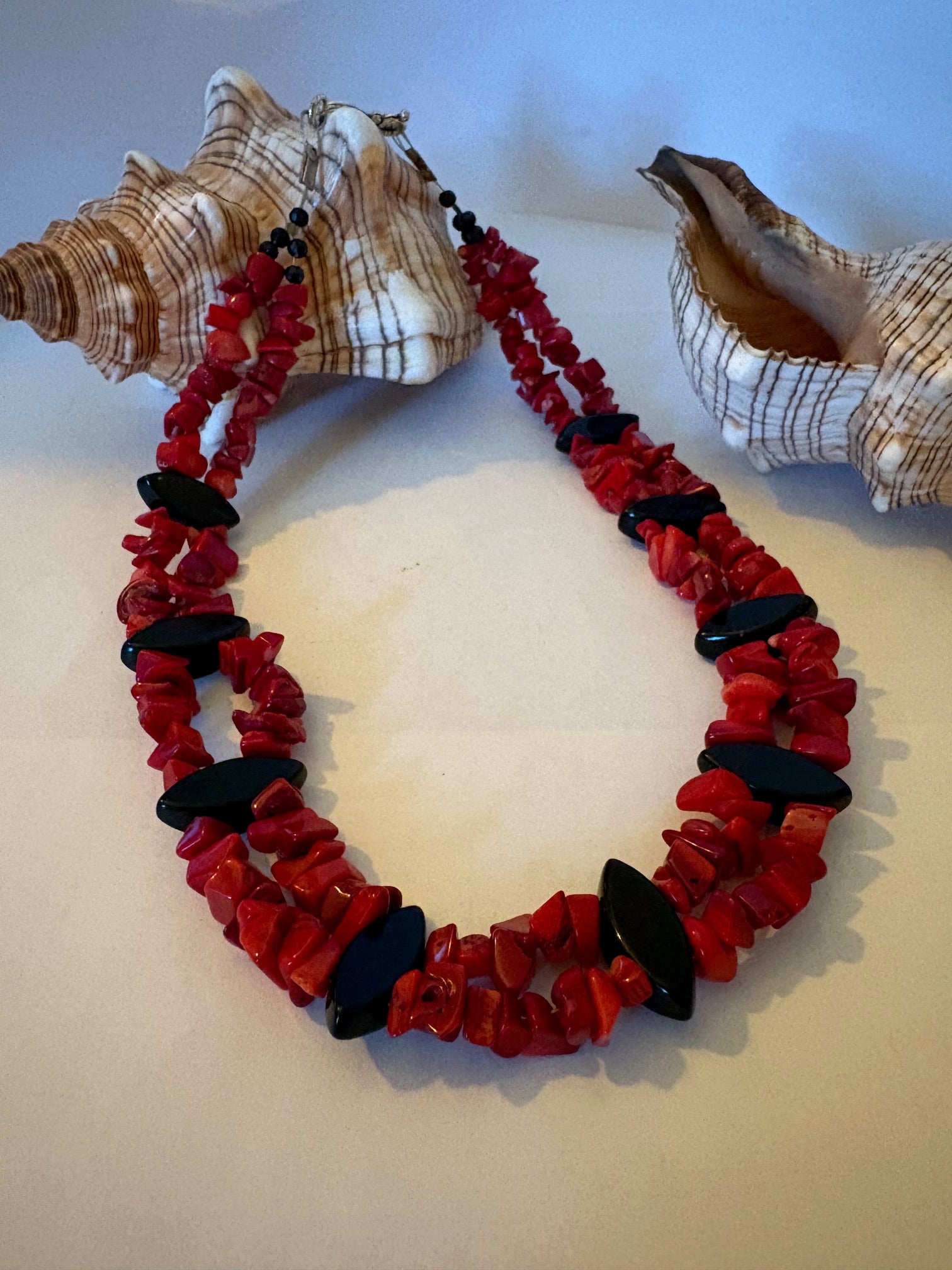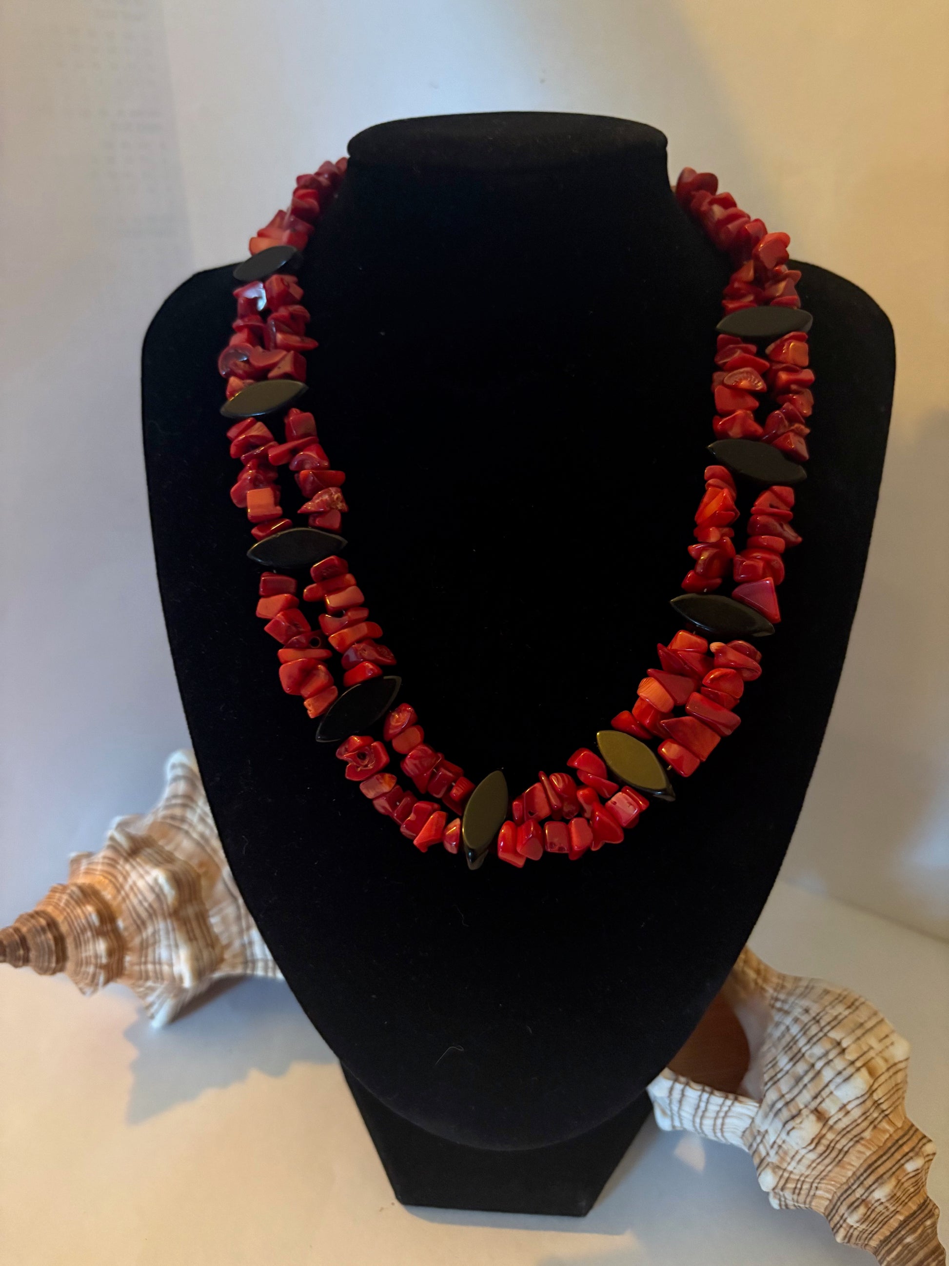 Elegante zweireihige Kette mit einer Gesamtlänge von ca. 45 cm, handwerklich gefertigt. Die Kette kombiniert naturrote Korallensplitter (ca. 0,5–0,9 cm) mit glänzenden schwarzen Obsidian-Ovalen (ca. 2 cm), die durch ihre spitzen Enden einen markanten Kontrast schaffen. Kleine schwarze Glasperlen an den Kettenenden und ein silberfarbener Hakenverschluss runden das Design ab. Ein charaktervolles Unikat für Liebhaber von Vintage-inspirierten Schmuckstücken mit natürlichen Materialien.