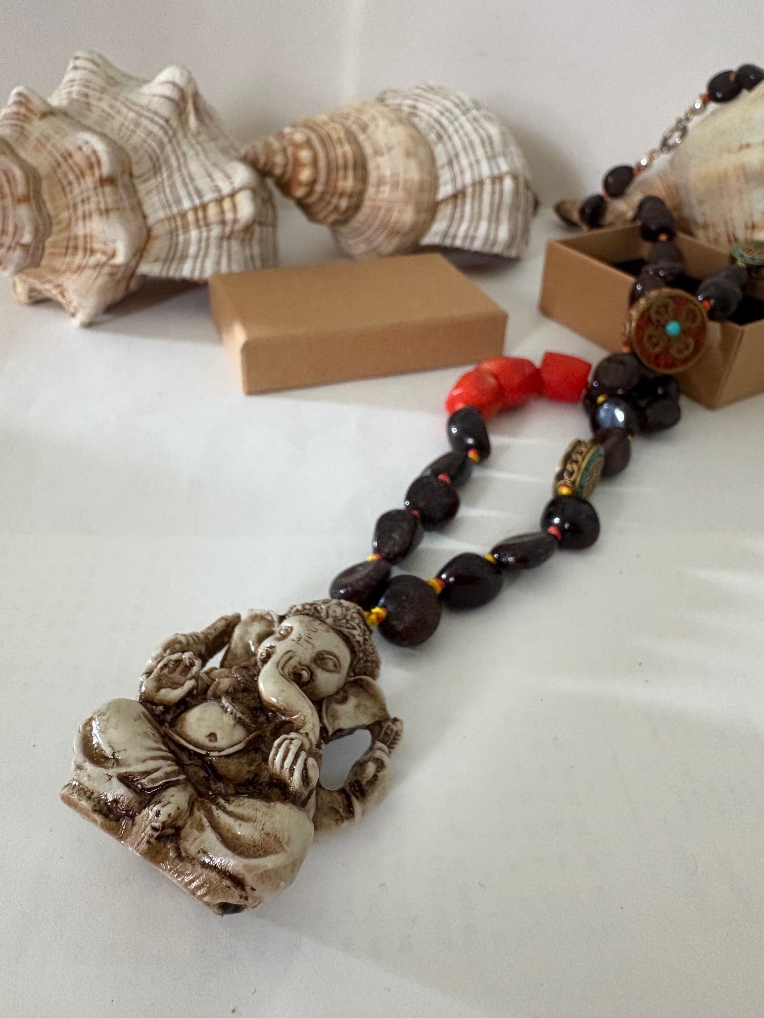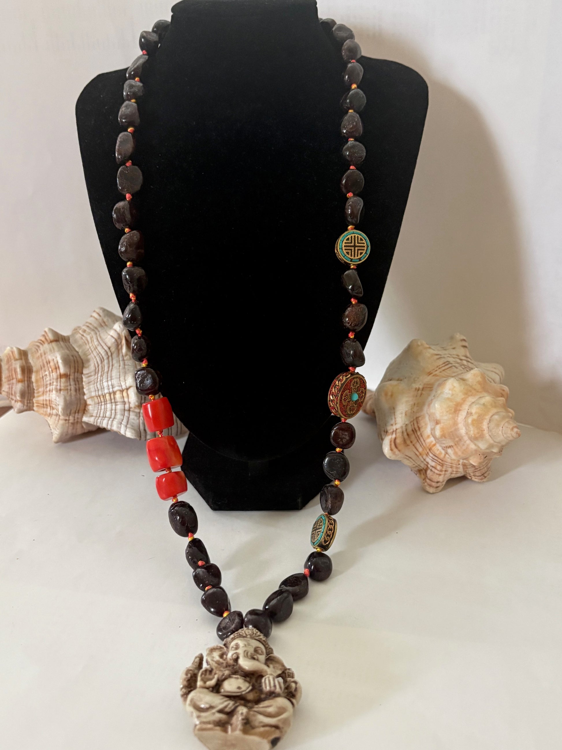Außergewöhnliche lange Kette aus natürlichem Granat und natürlicher Lachs-Koralle mit figürlichem Ganesha-Anhänger, Vajra-Symbol und dekorativen Kreuz-Amuletten. Ausdrucksstarkes Schmuckstück mit tibetisch inspiriertem Design.