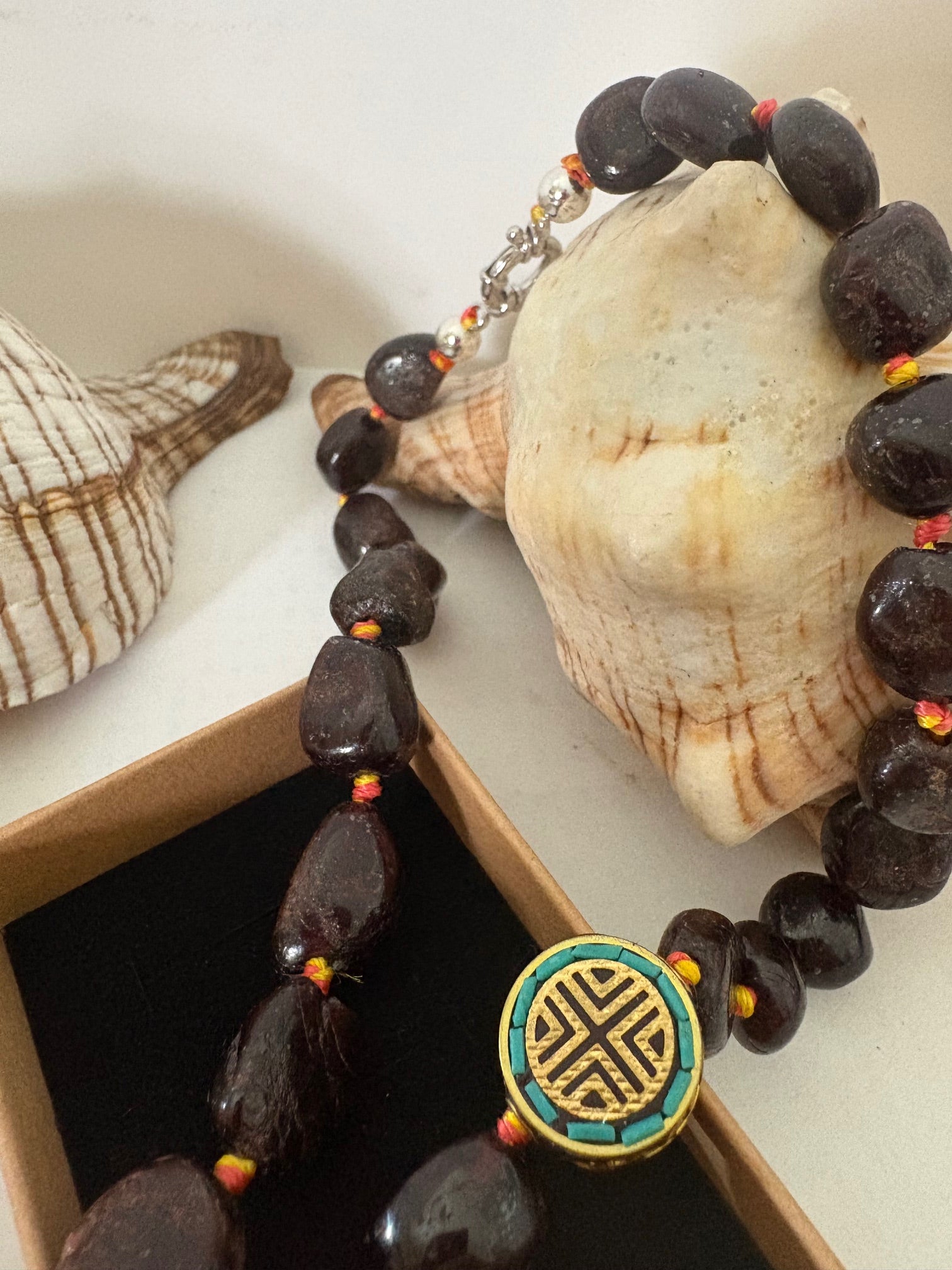 Diese außergewöhnliche, handgefertigte Halskette vereint natürlichen Granat und natürliche Lachs-Koralle zu einem ausdrucksstarken Schmuckstück mit tibetisch inspirierter Symbolik. Die polierten Granatsteine sind in unregelmäßigen Formen und variierenden Größen gearbeitet und zeigen ihre typisch dunkelrote bis fast schwarze Farbgebung. Dazwischen setzen rote Korallenelemente markante Farbakzente.