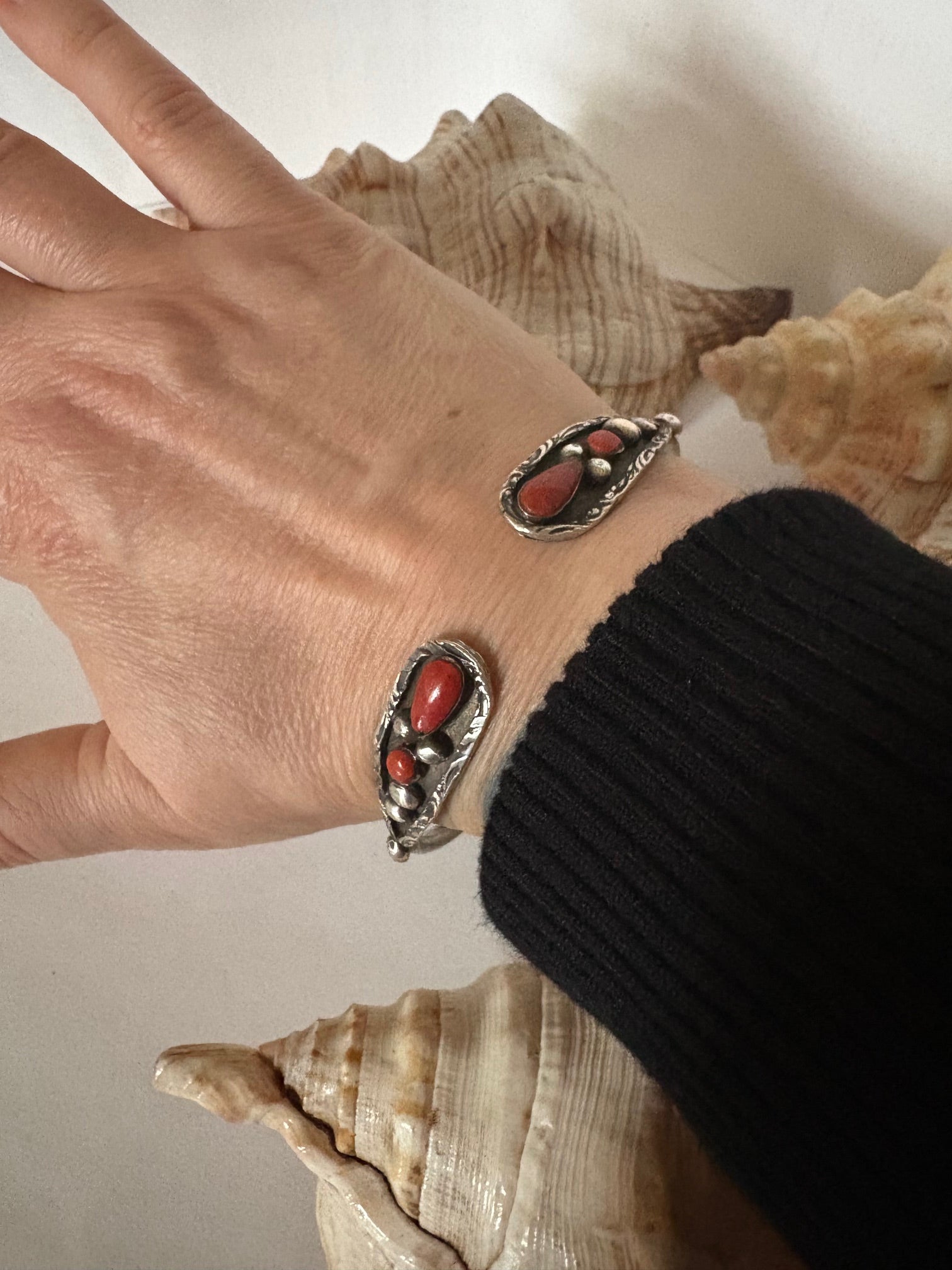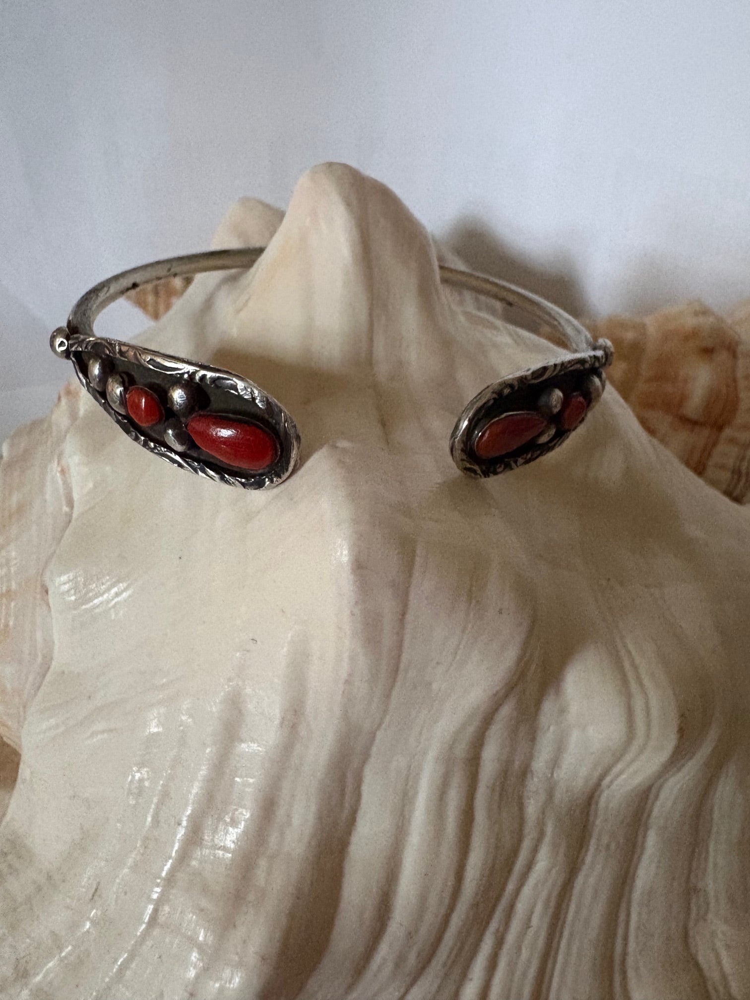 Silberner Vintage-Armreif mit roter Koralle – klassischer Statement-Armreif