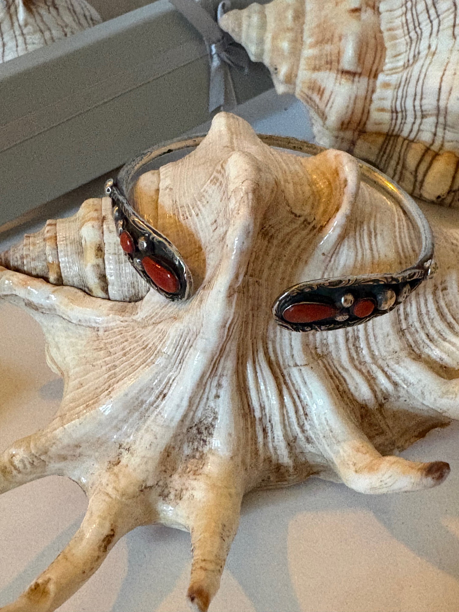 Der Armreif befindet sich in gebrauchtem Vintage-Zustand. Altersbedingte Gebrauchsspuren sind möglich und gehören bewusst zum Charakter dieses Schmuckstücks. Ein ideales Accessoire für Liebhaber:innen von klassischem Silberschmuck mit Koralle und ausdrucksstarken Einzelstücken.