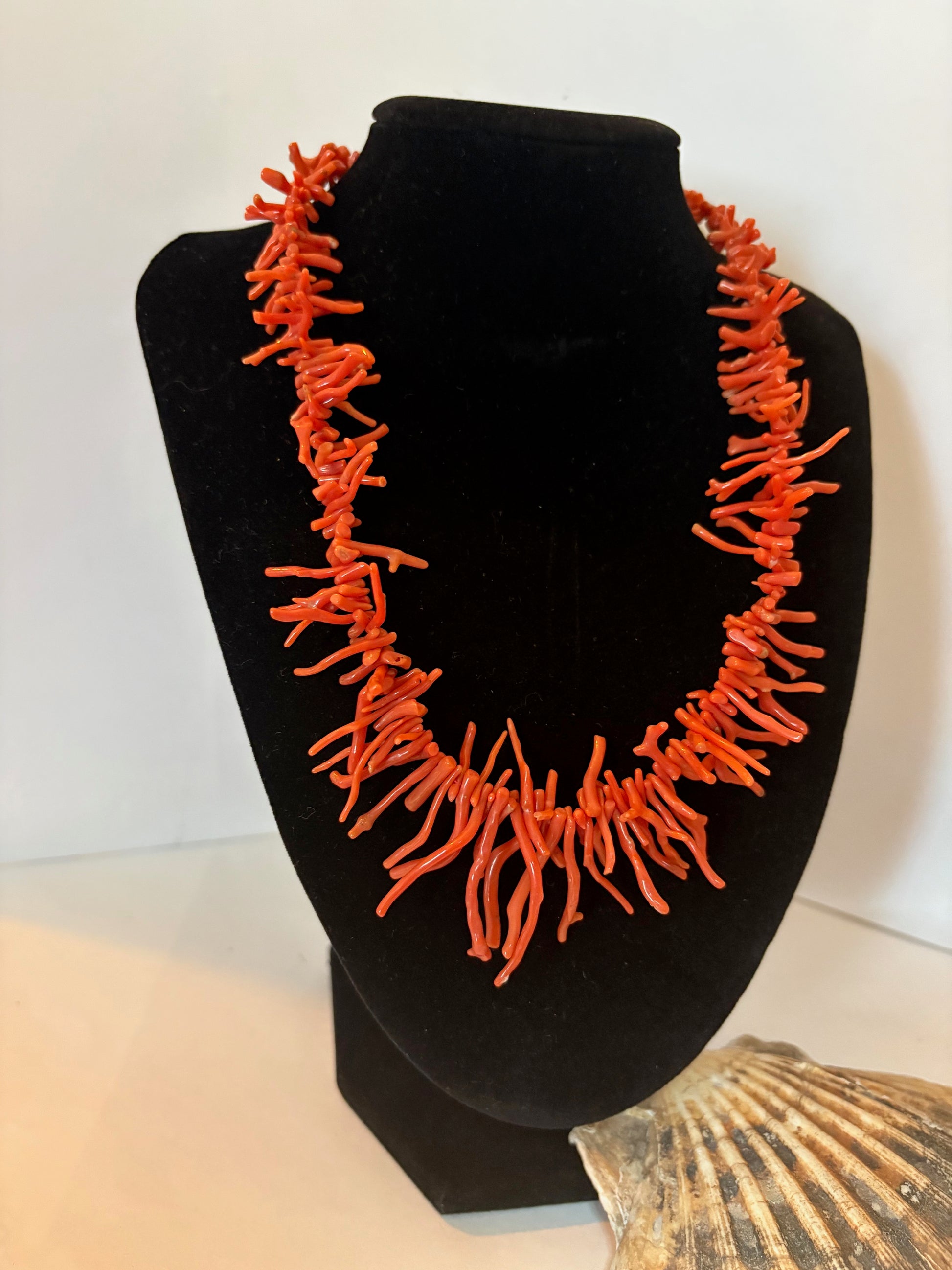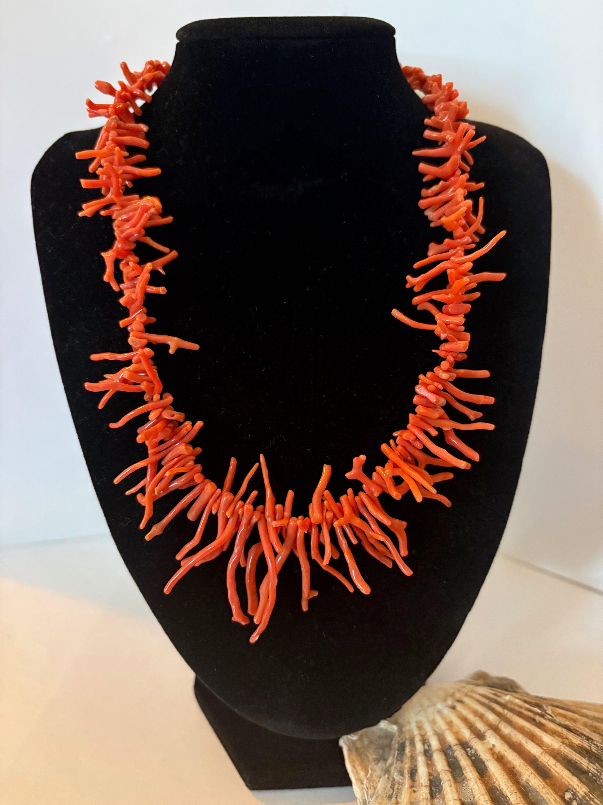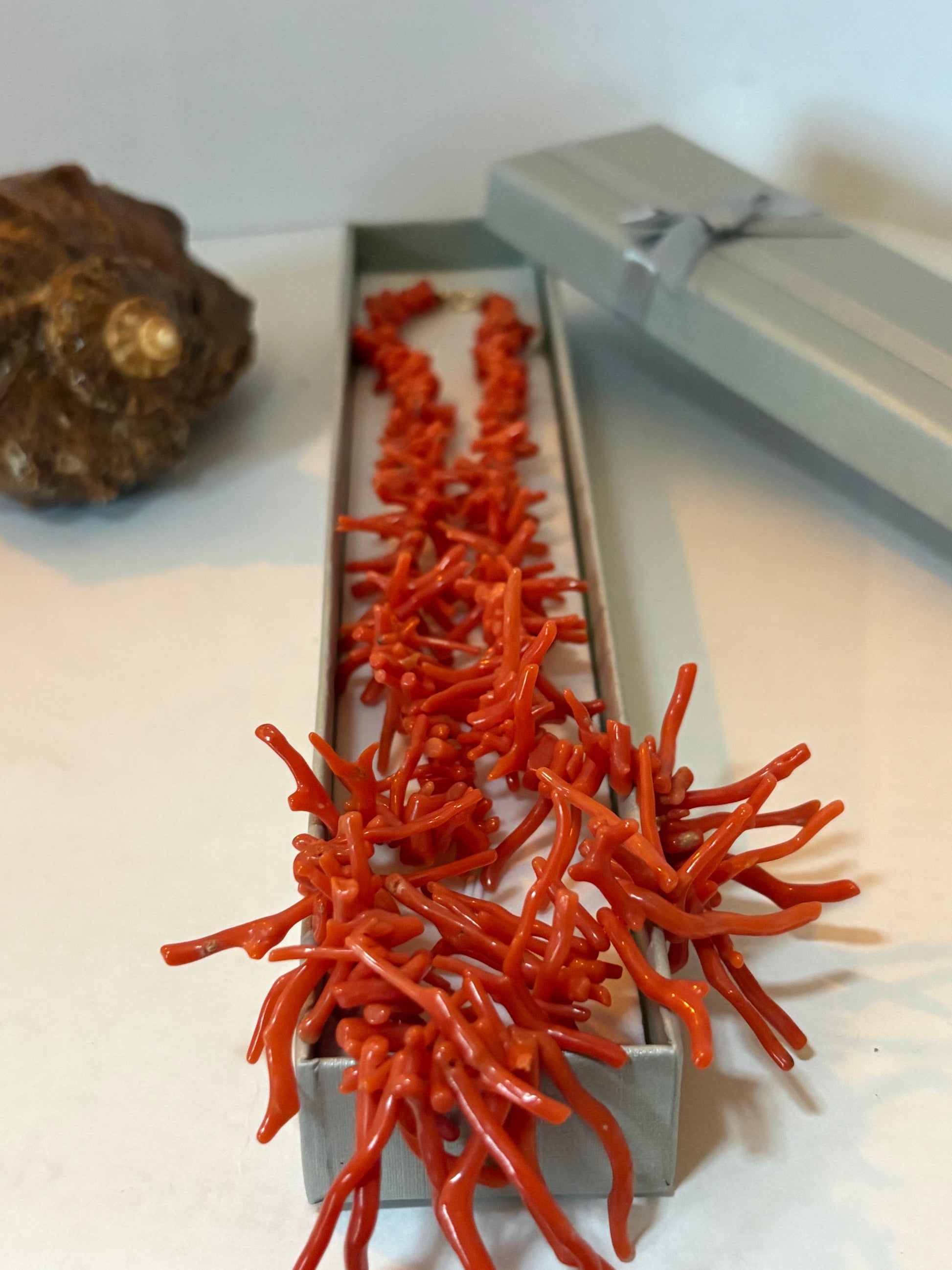 Diese Vintage-Astkorallenkette überzeugt durch ihre intensive rote Farbgebung und die lebendige, organische Struktur der Korallenäste. Die naturbelassenen Korallenelemente sind unregelmäßig geformt und verleihen dem Schmuckstück eine ausdrucksstarke, individuelle Erscheinung – jede Kette wirkt dadurch als Unikat.