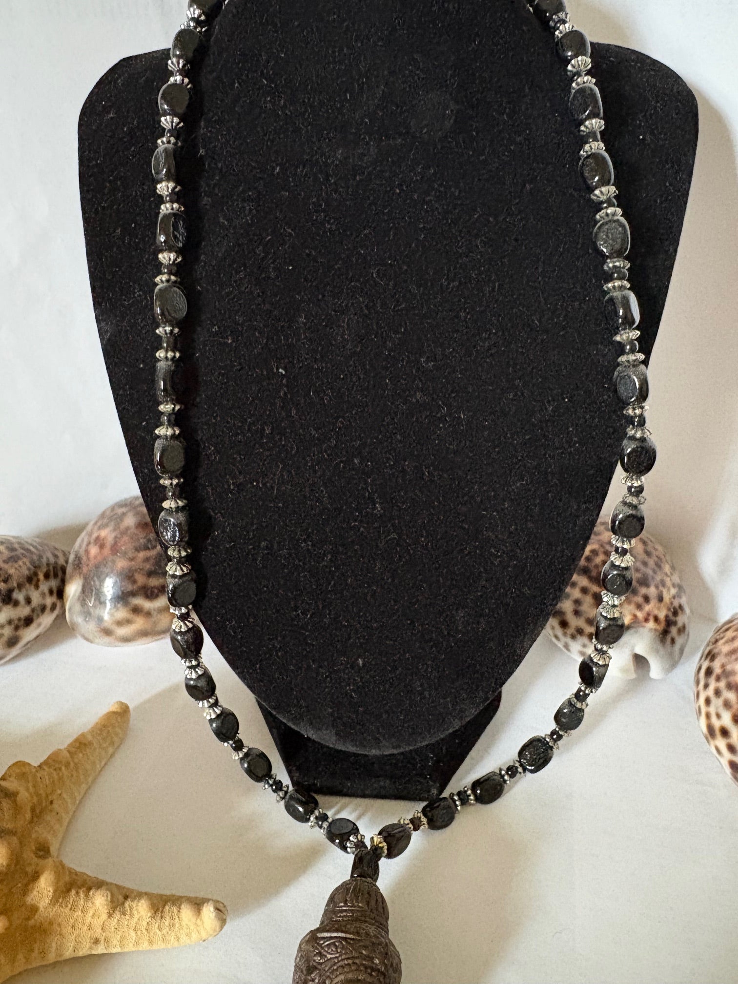 Markante Vintage-Halskette mit großem dekorativem Anhänger, dunklen Perlen/Steinen und metallfarbenen Zwischenelementen. Länge ca. 73 cm. Gebraucht mit altersbedingten Spuren.