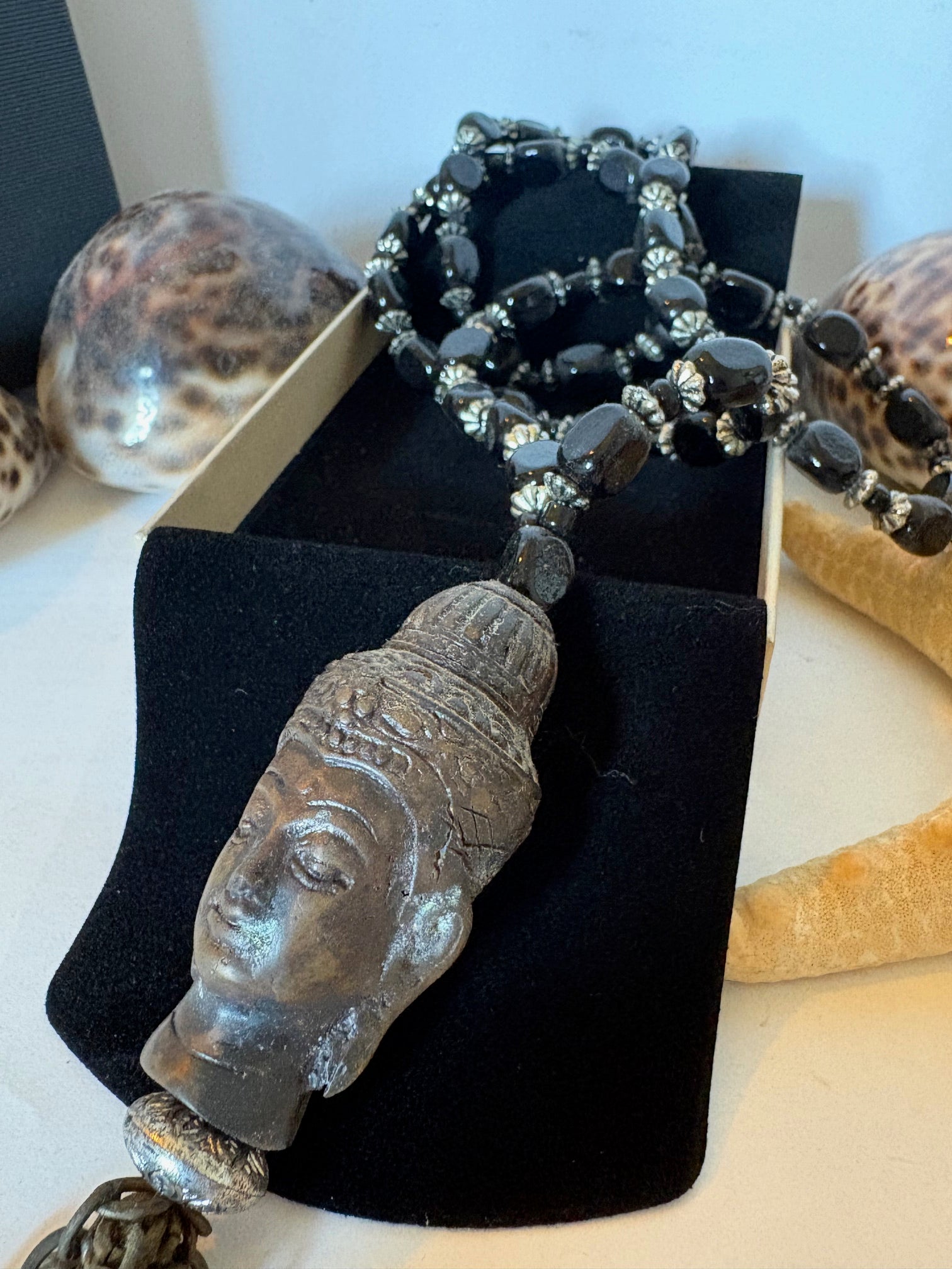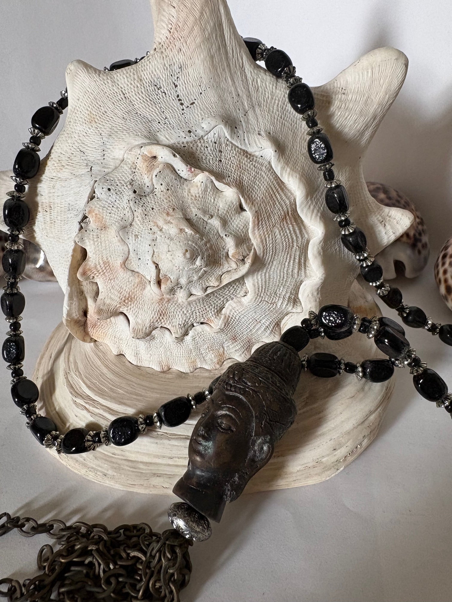 Besonderes Highlight ist der große, plastisch gearbeitete Kopf-Anhänger mit Kettenquaste, der der Kette eine markante, leicht ethnisch inspirierte Ausstrahlung verleiht.