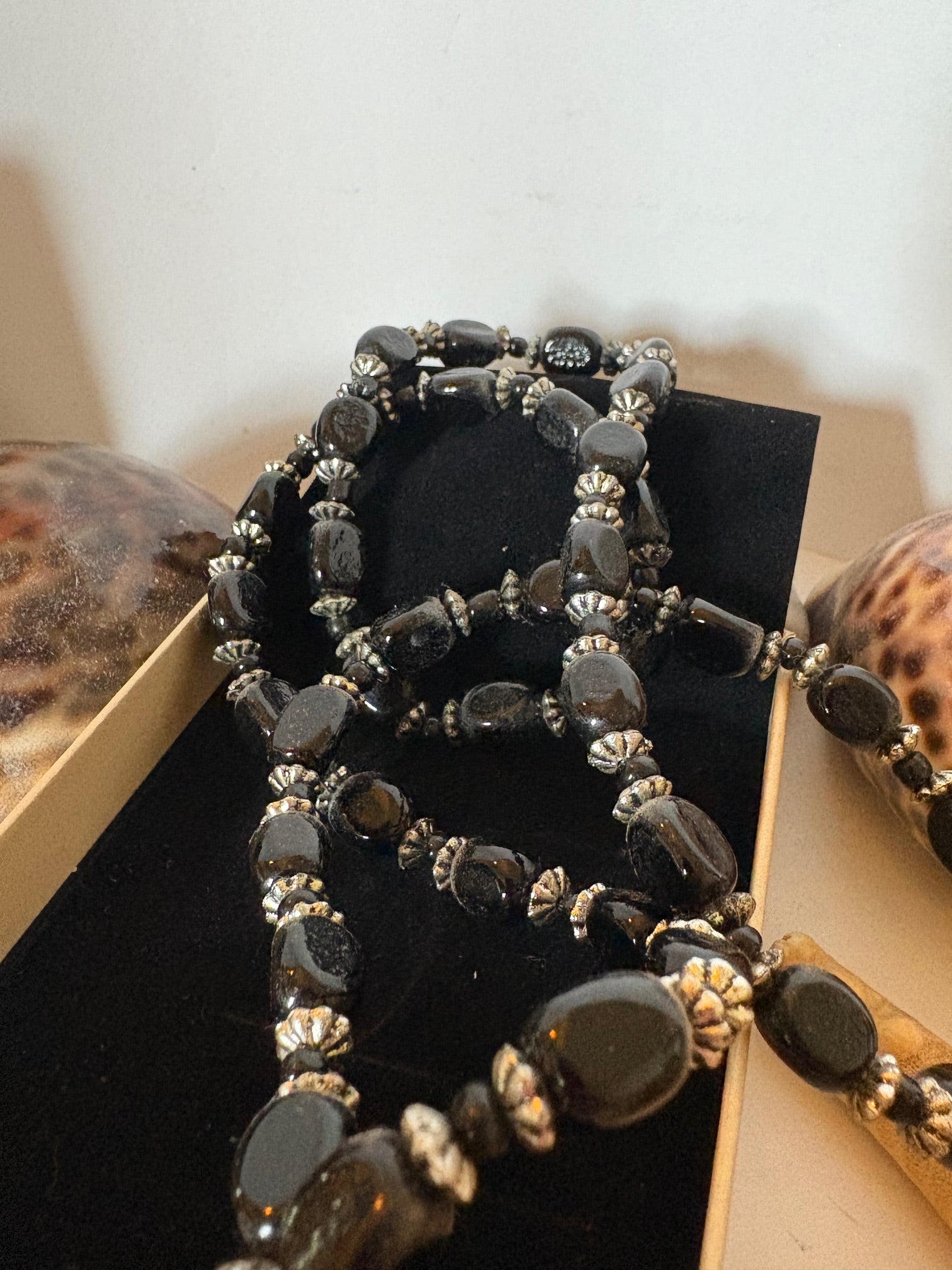 Die Kette besteht aus dunklen, unregelmäßig geformten Perlen/Steinen mit glänzender Oberfläche, kombiniert mit metallfarbenen Zwischenelementen in dekorativer Gestaltung.