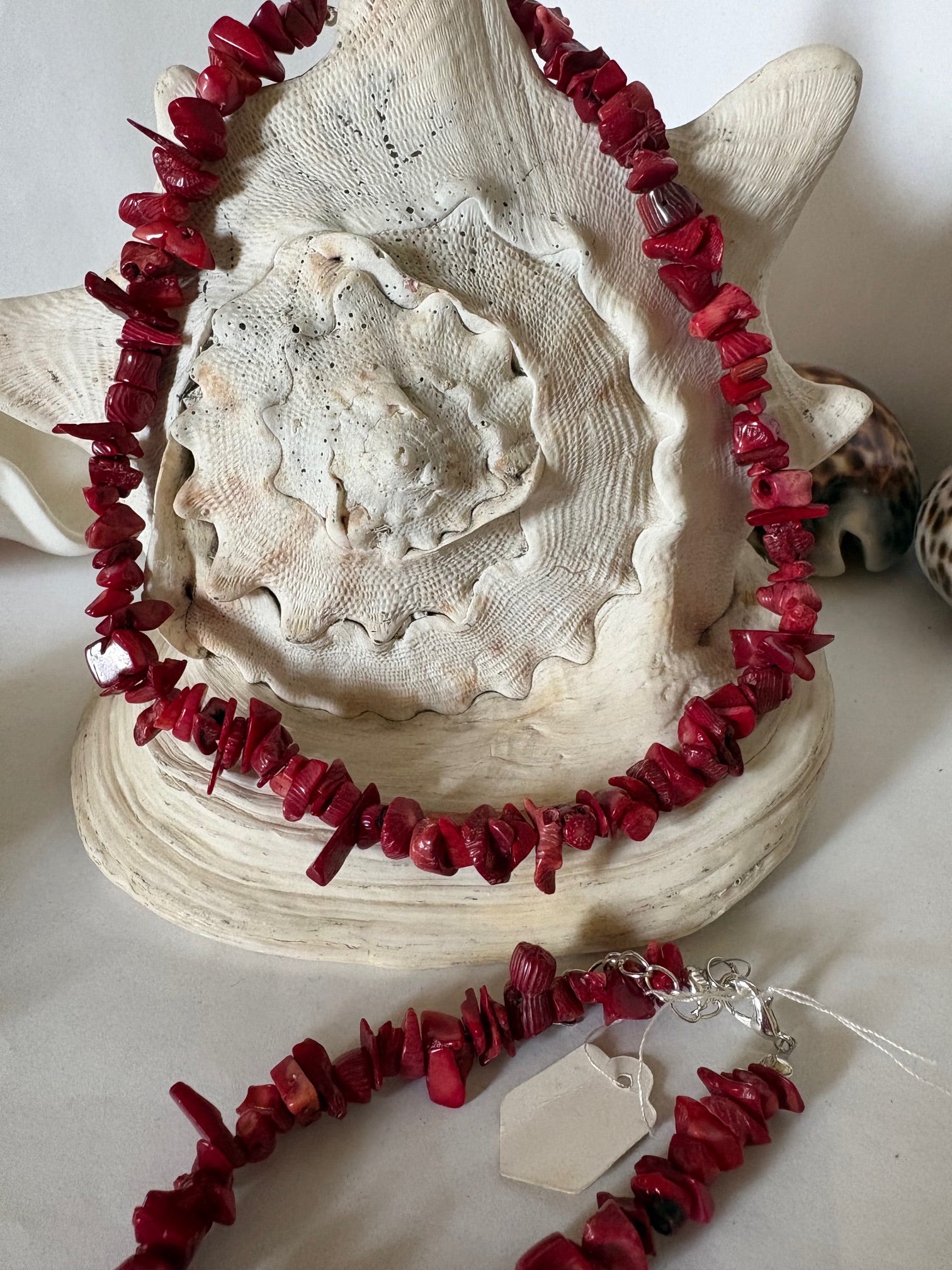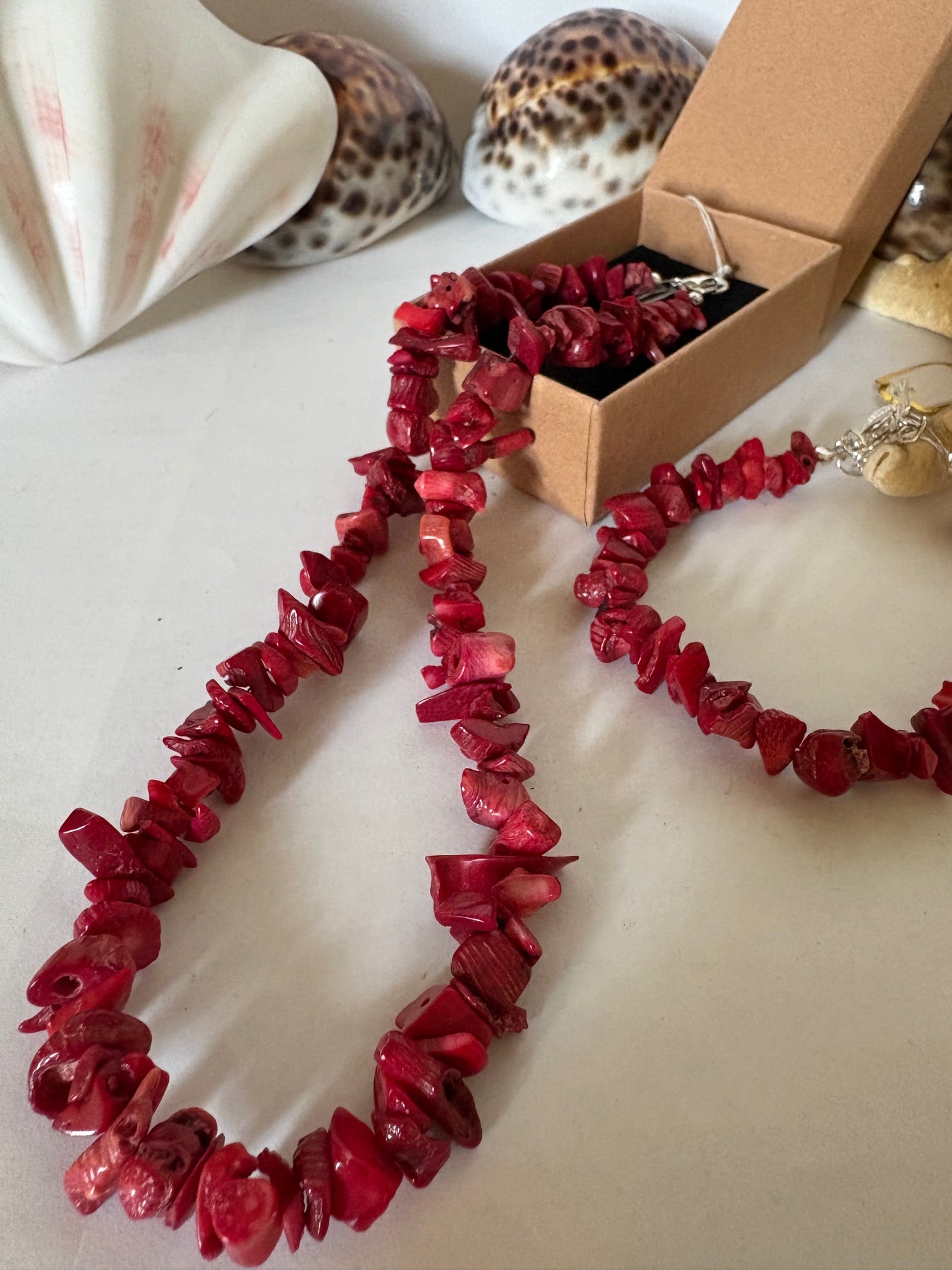 Dieses stilvolle Vintage-Schmuckset aus Koralle verbindet klassische Eleganz mit charaktervoller Ausstrahlung. Die warme, intensive Rotfärbung und die natürlich unregelmäßige Formgebung der einzelnen Elemente verleihen dem Set eine lebendige und authentische Optik.