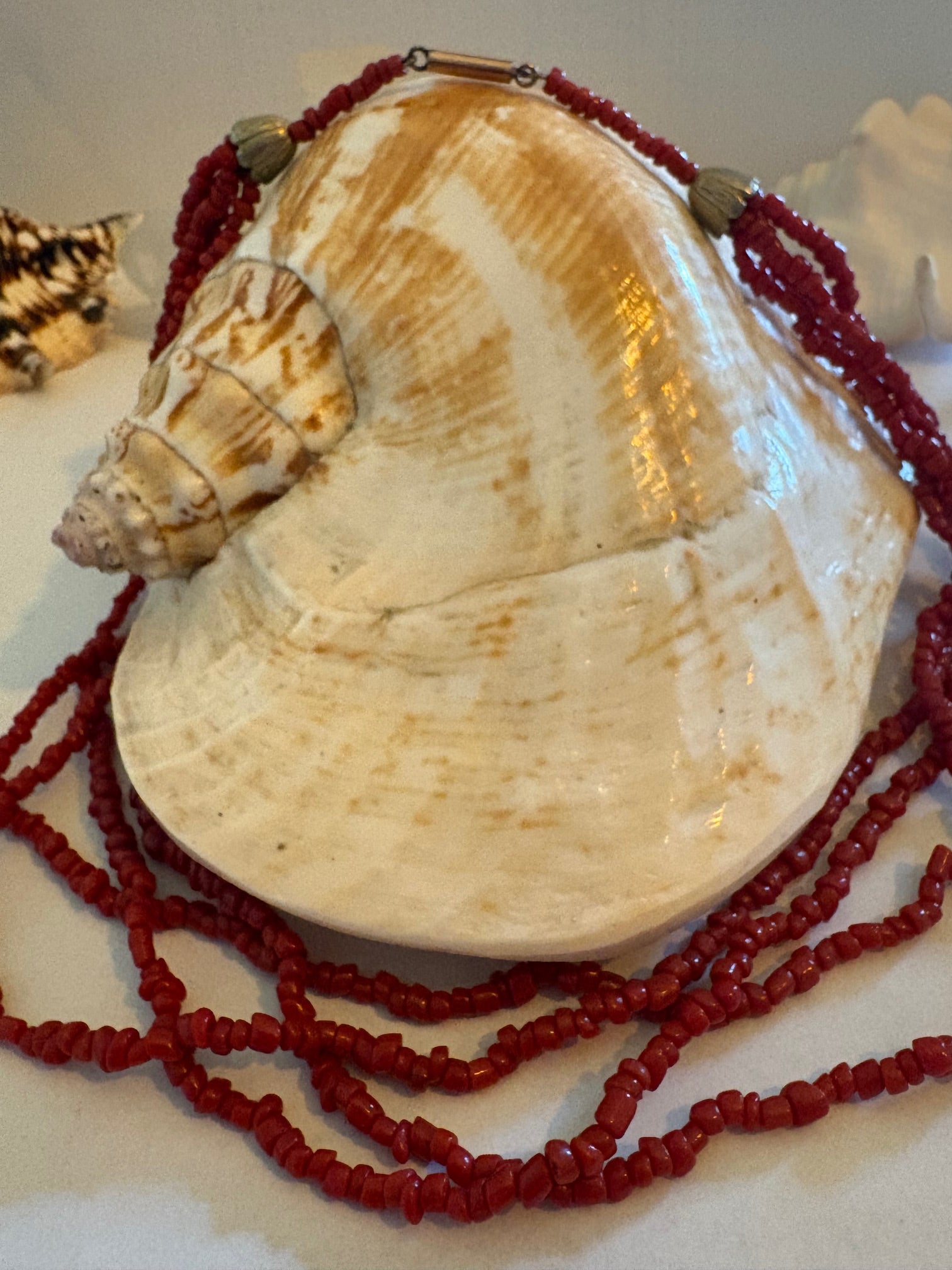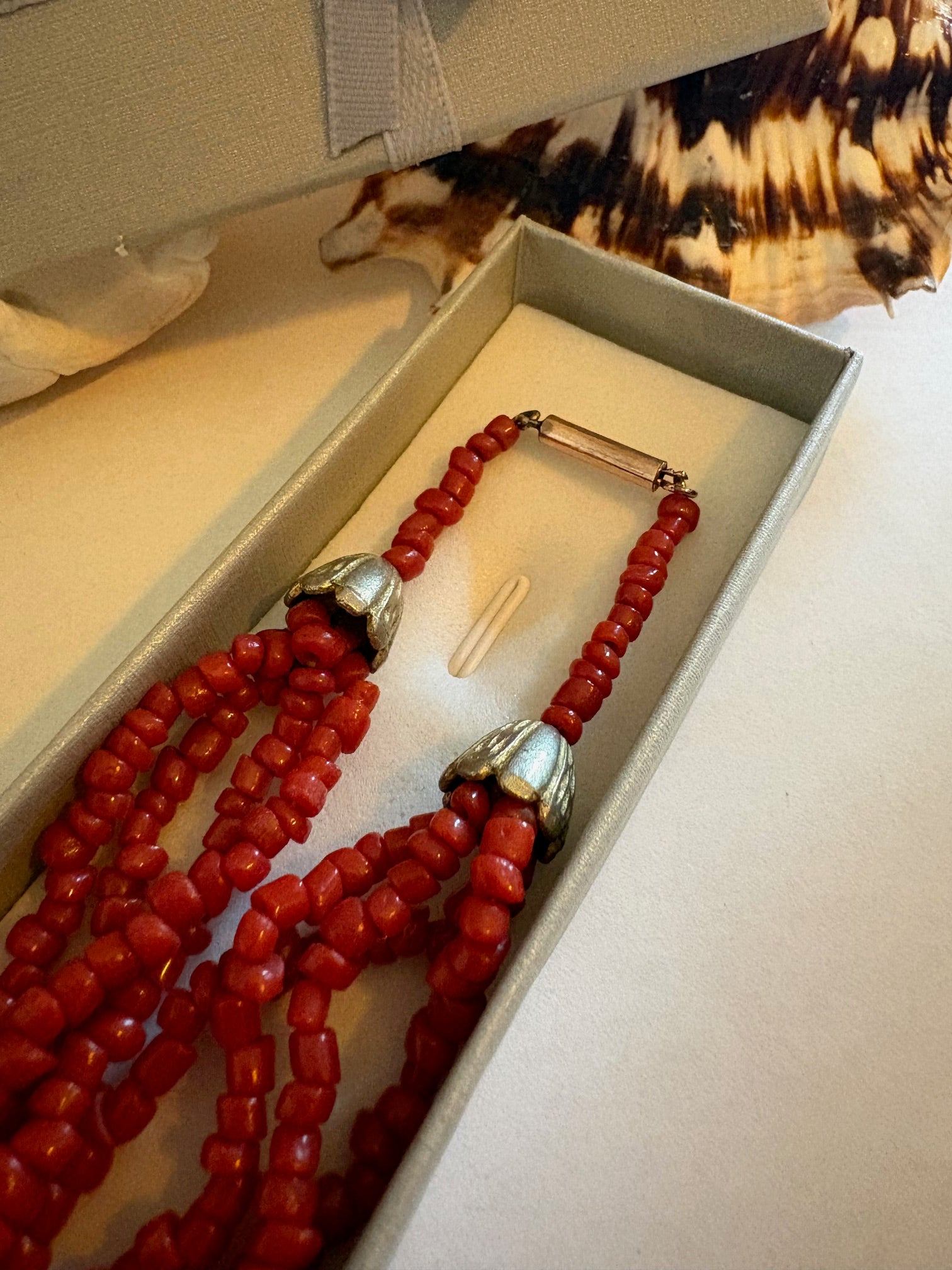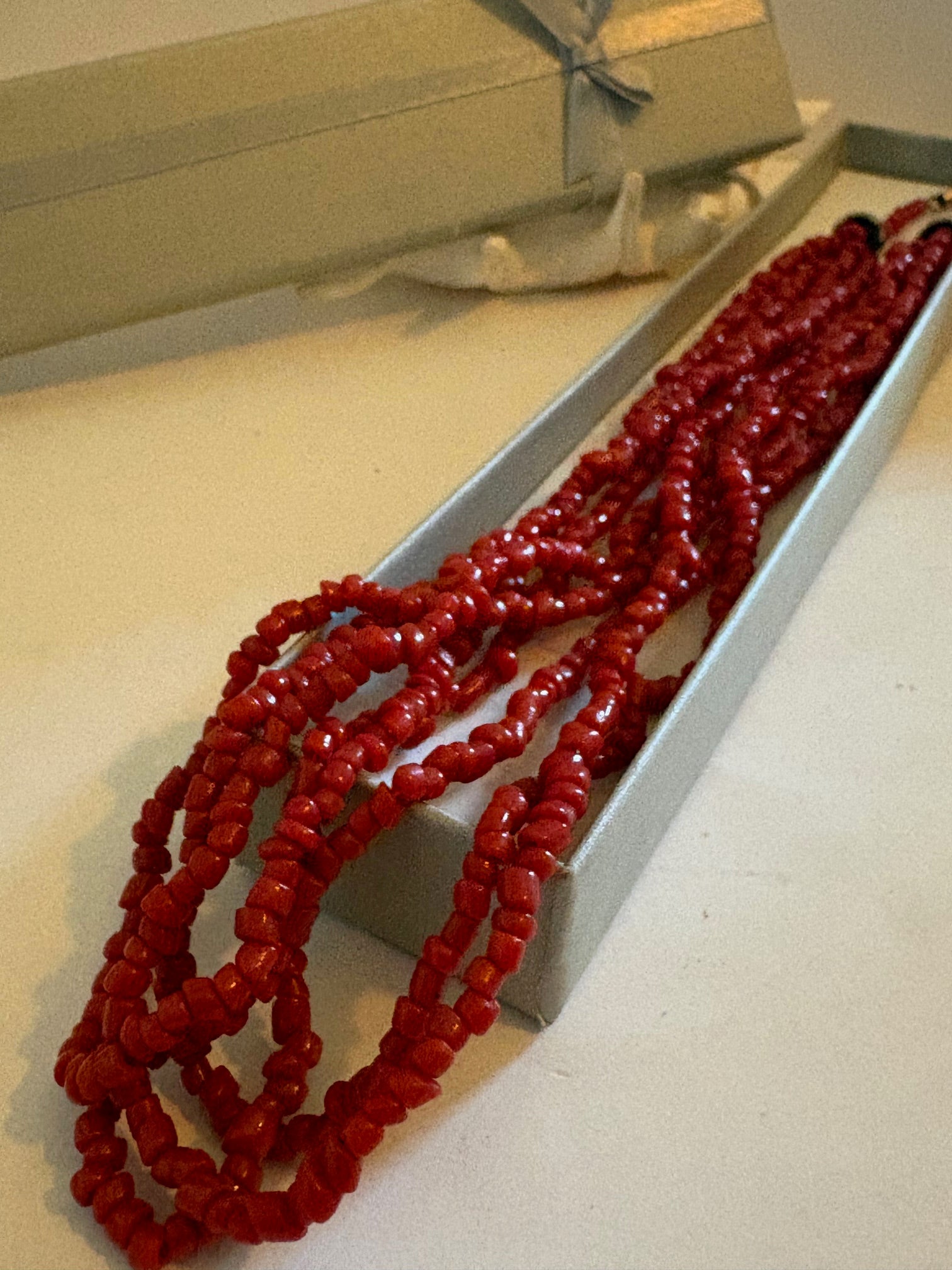 Diese mehrreihige Vintage-Kette überzeugt durch ihre kräftige rote Farbwirkung und die harmonisch aufeinander abgestimmten Stränge, die gemeinsam einen klassischen und ausdrucksstarken Gesamteindruck erzeugen. Die Mehrreihigkeit verleiht dem Schmuckstück eine lebendige Tiefe und dezente Fülle, ohne aufdringlich zu wirken.