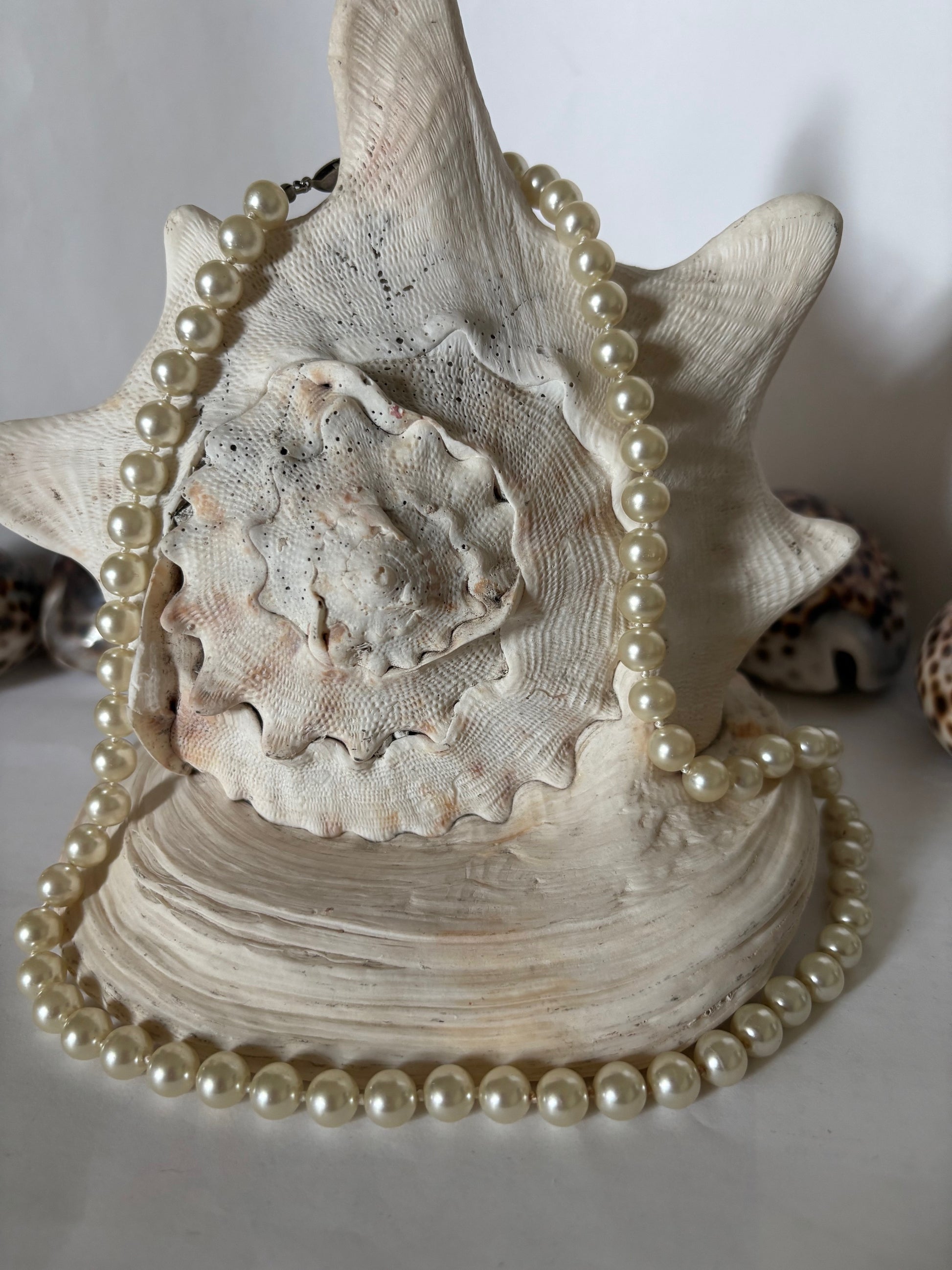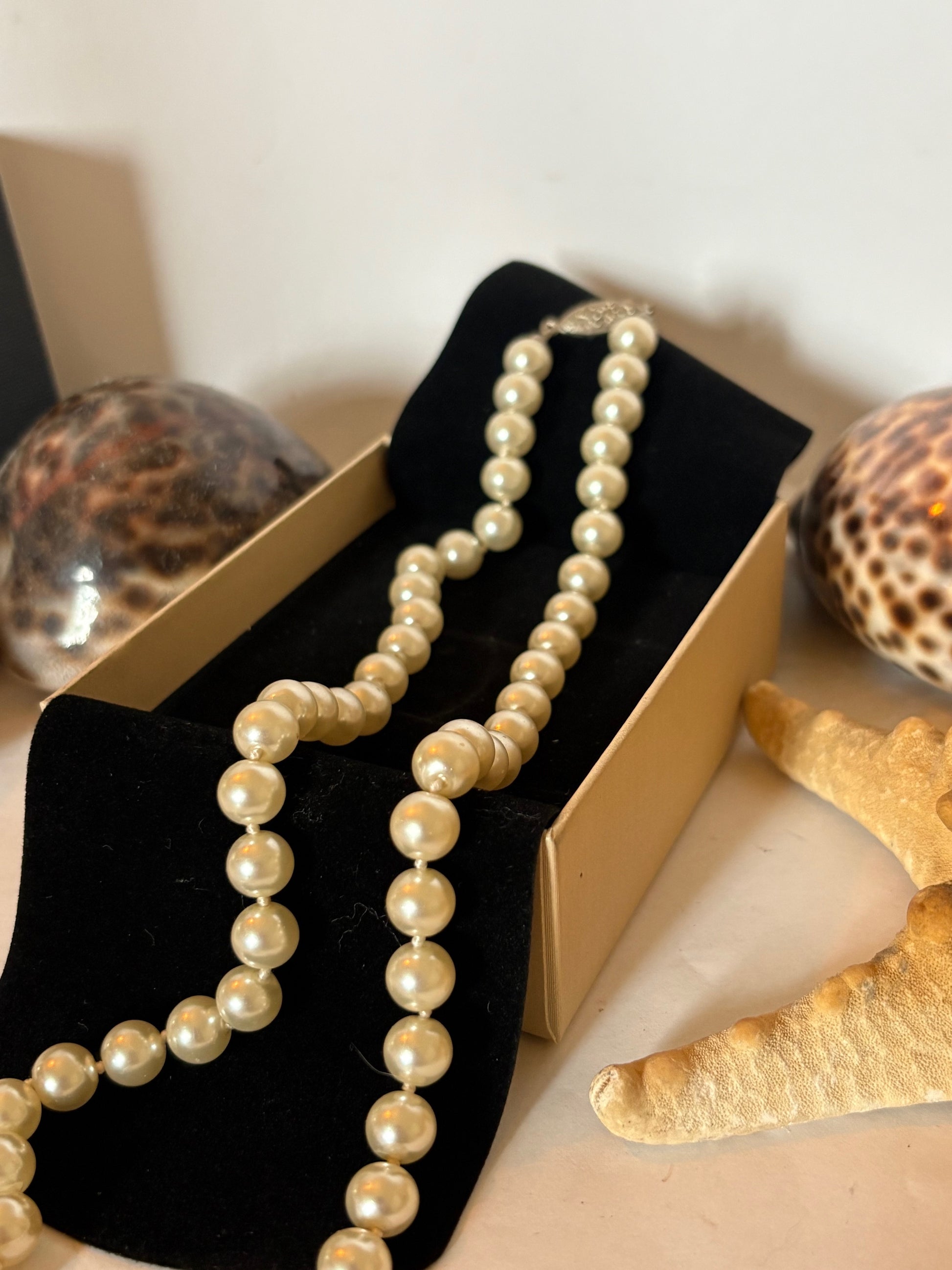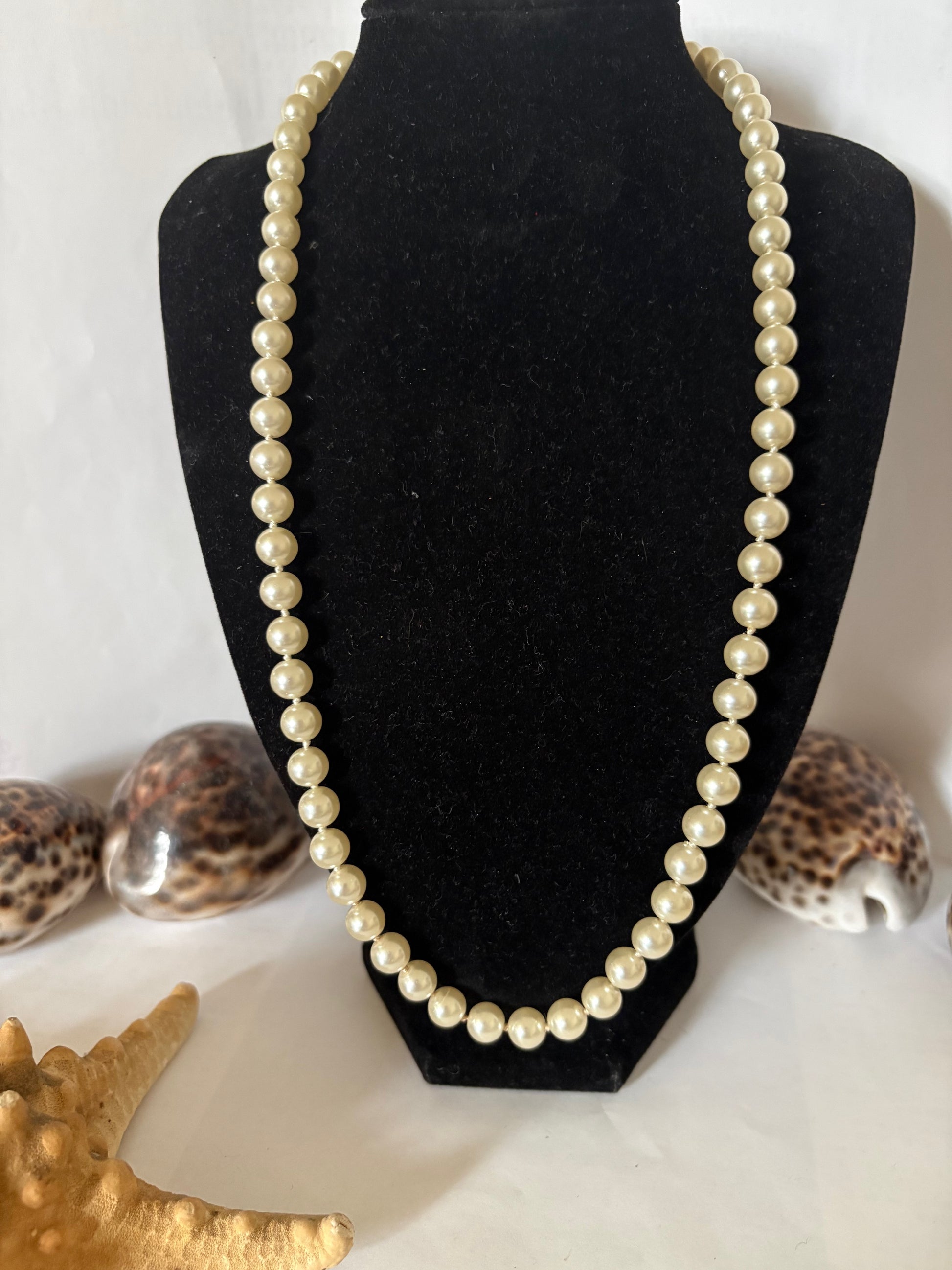 Elegante Vintage-Perlenkette mit cremefarbenen Kugelperlen und dekorativer Metallschließe. Klassisches Design, ca. 57 cm lang. Gebraucht.