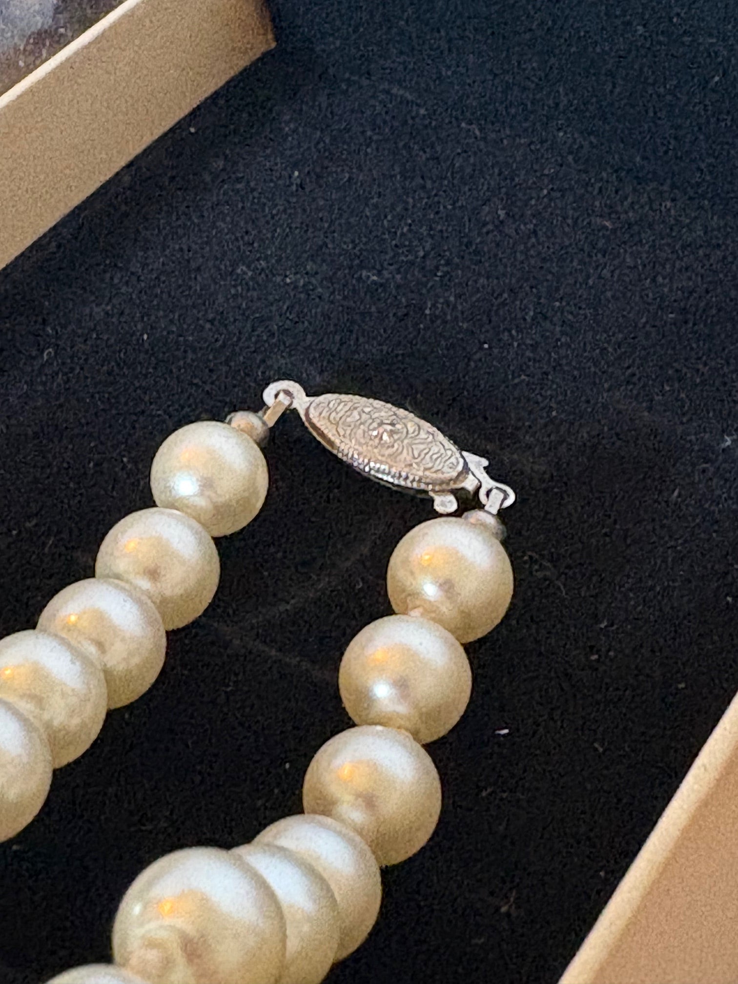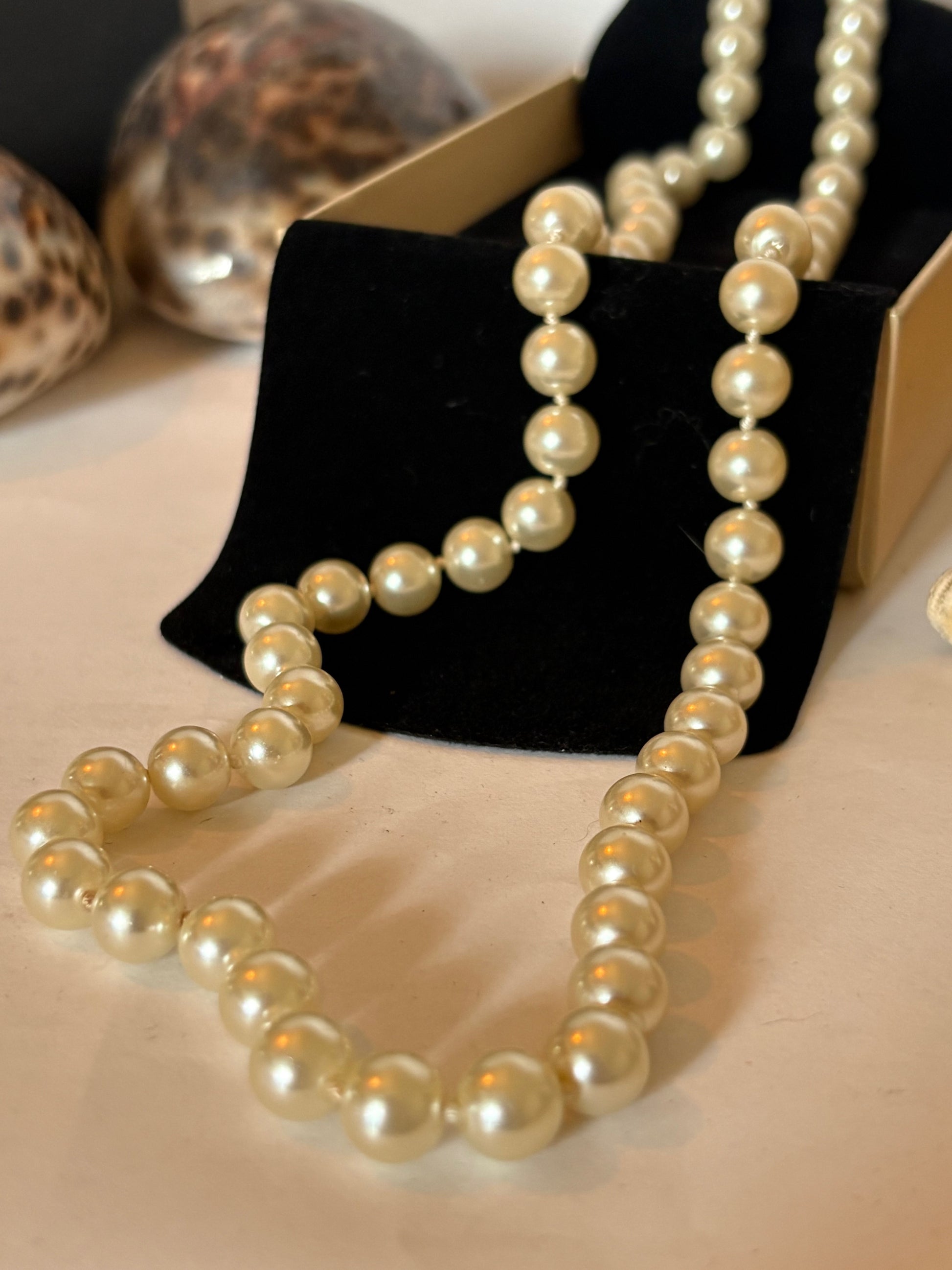 Diese klassische Vintage-Perlenkette besticht durch ihre creme- bis champagnerfarbenen Kugelperlen mit sanftem Glanz.