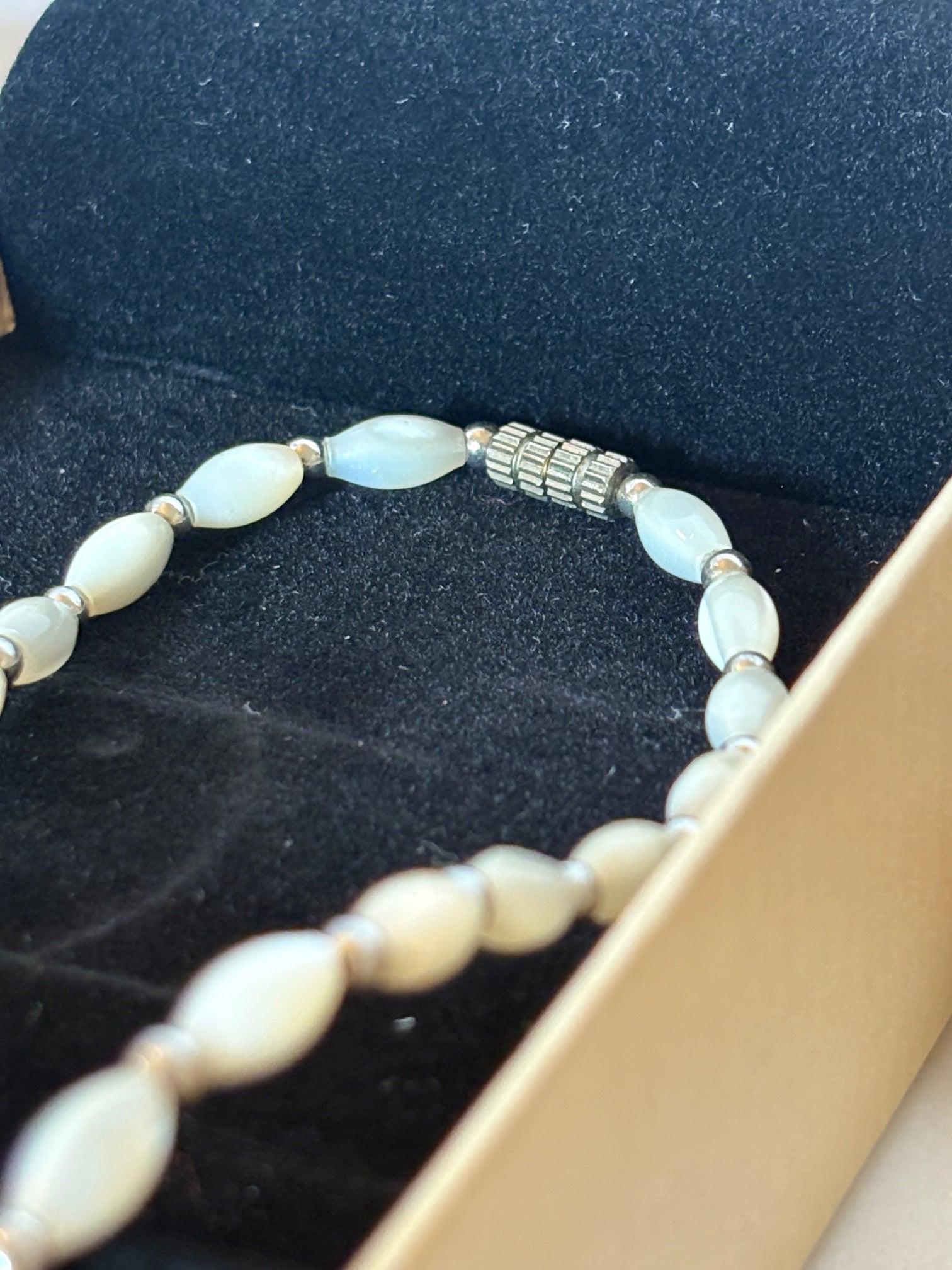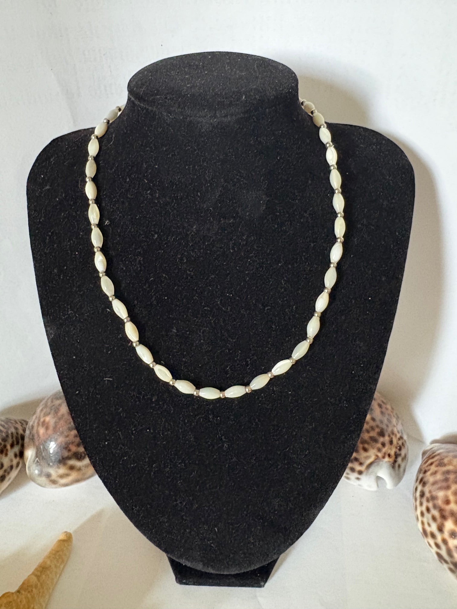 Diese elegante Vintage-Perlenkette besticht durch ihre cremeweißen, olivenförmigen Perlen in klassischer Anordnung. Kleine silberfarbene Zwischenelemente sorgen für dezente Akzente und unterstreichen das zeitlose Design.