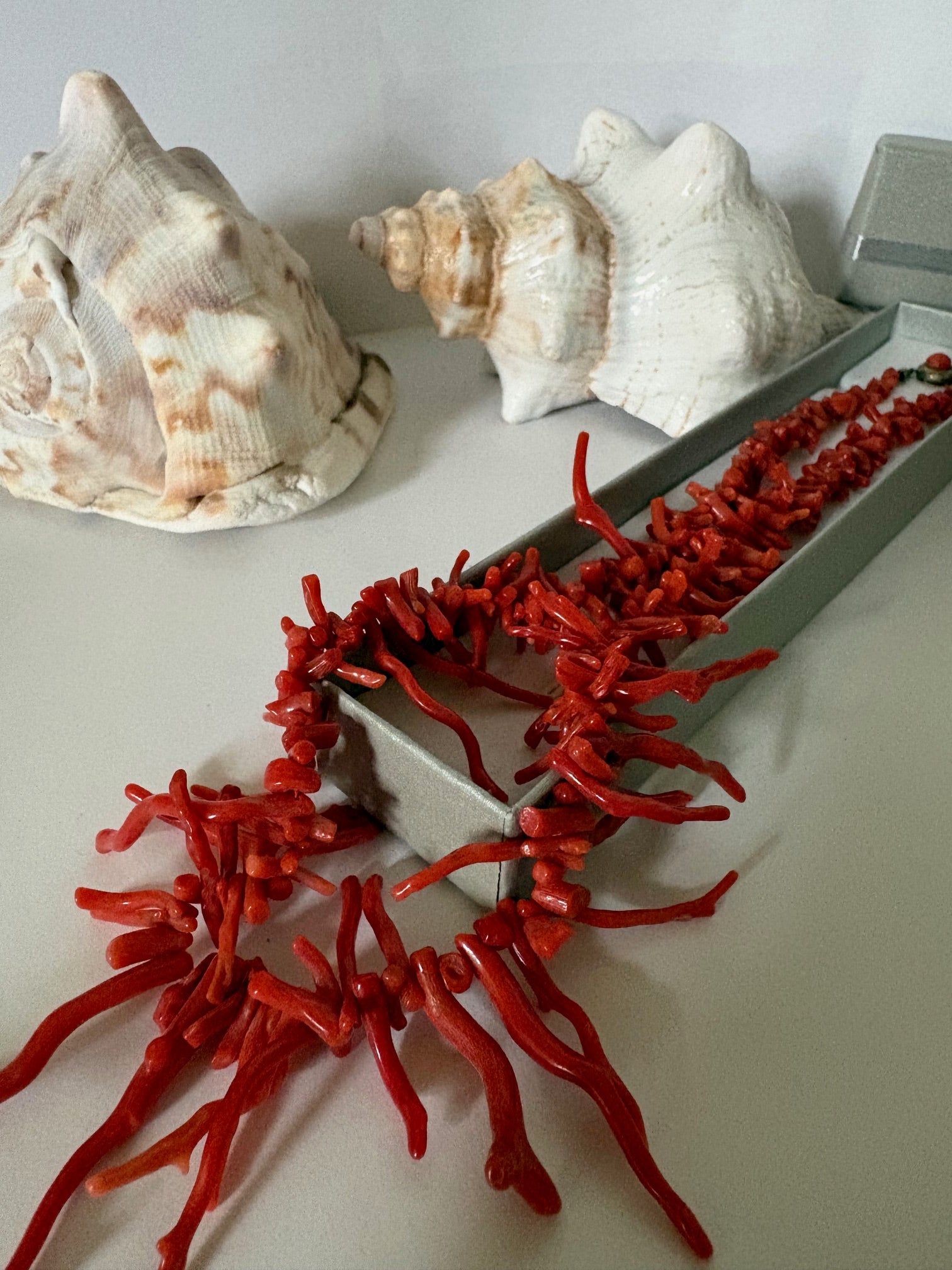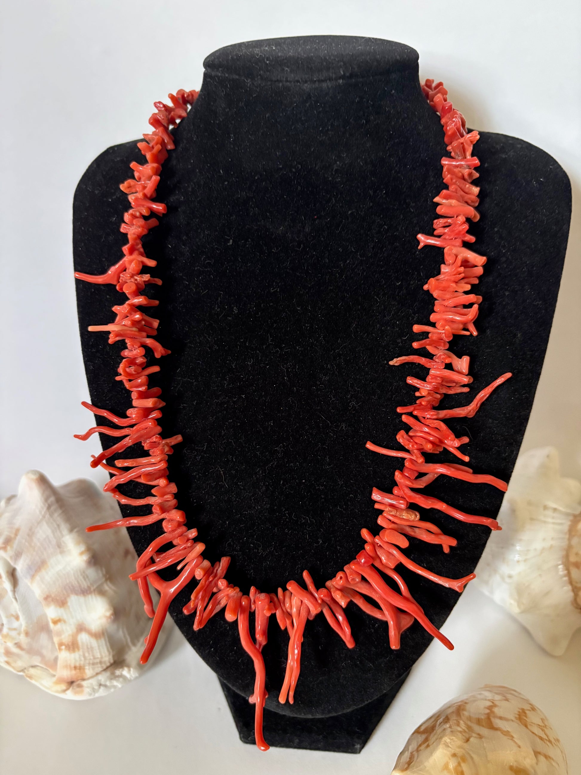 Diese Korallenkette zeigt filigran verzweigte, astähnliche Korallenelemente, die in unregelmäßiger Form aufgefädelt sind und dem Schmuckstück eine lebendige, organische Wirkung verleihen. Die einzelnen Korallenstücke variieren leicht in Form, Länge und Farbton und zeigen typische natürliche Strukturen, die den individuellen Charakter des Materials unterstreichen.