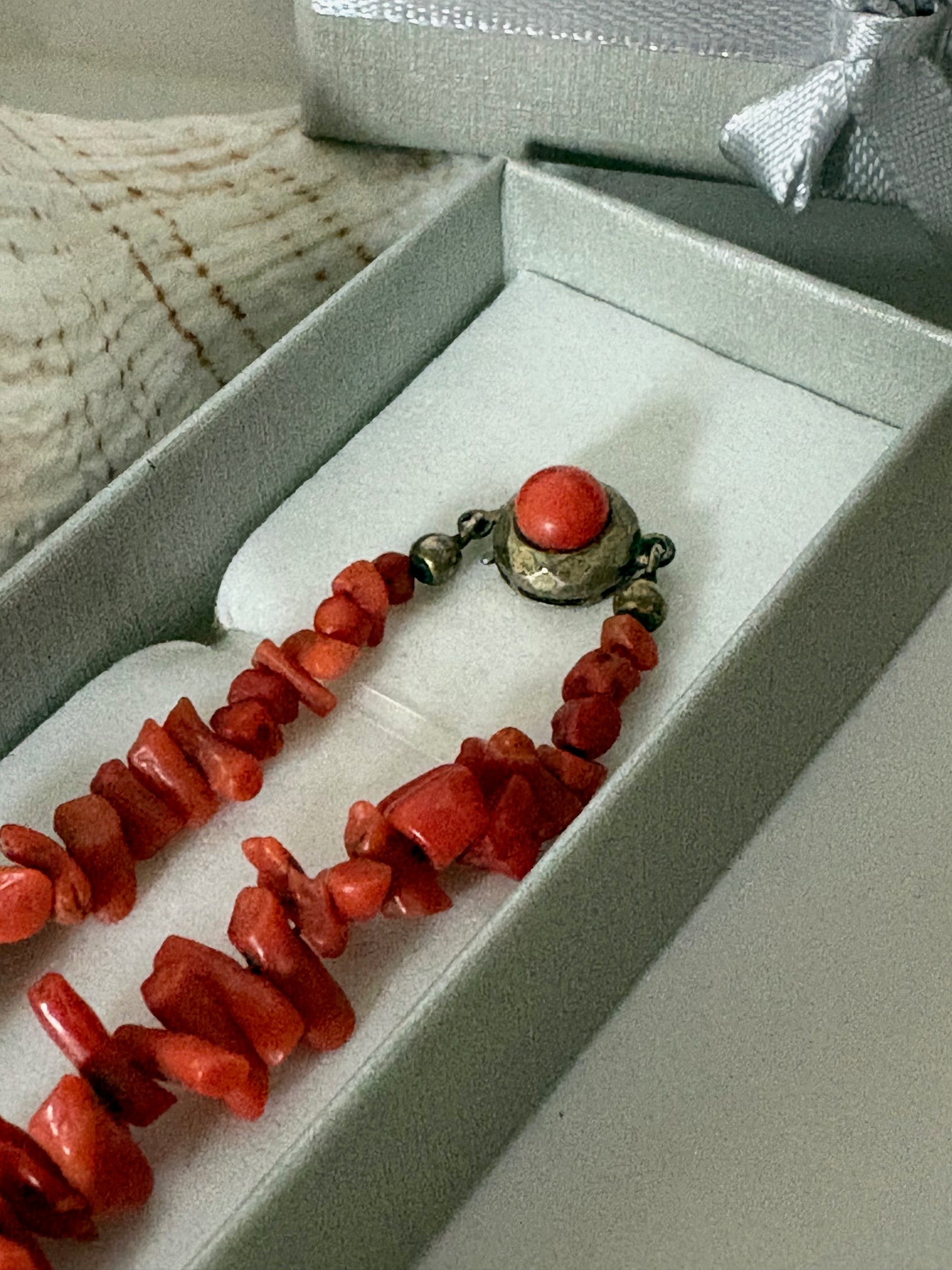 Materialangaben erfolgen nach bestem Wissen und auf Grundlage äußerer Merkmale. Es liegen keine Herkunfts-, Alters- oder Artenschutznachweise (CITES) vor. Die Kette wird nicht als Edelkoralle angeboten.