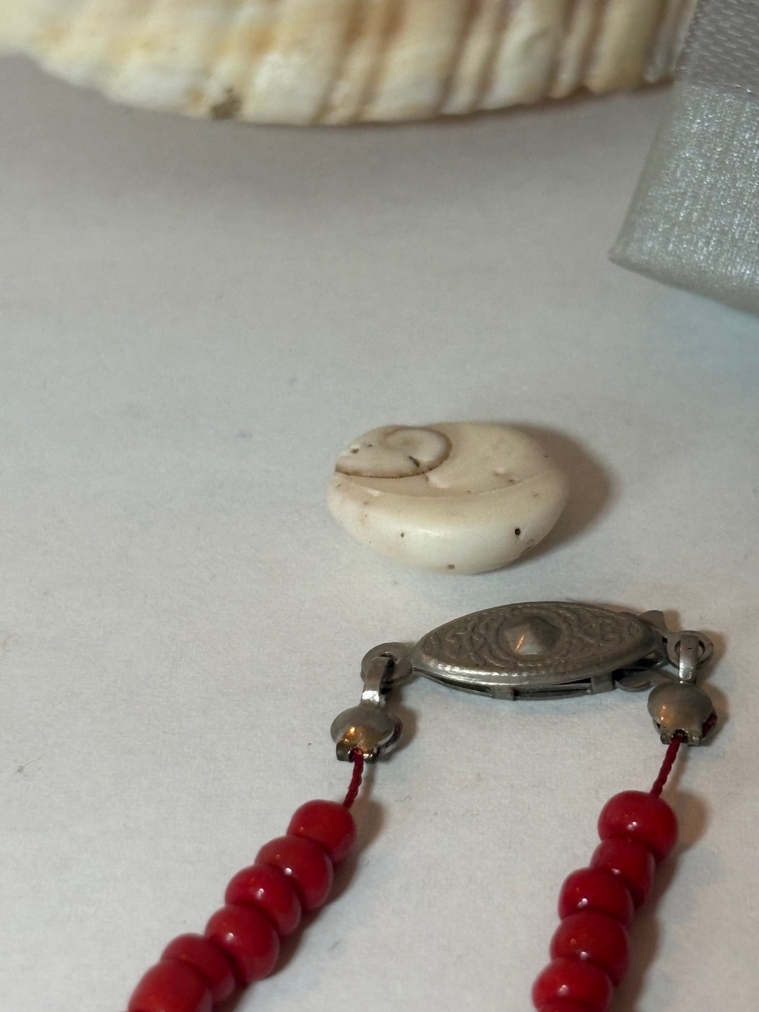 Diese authentische Vintage-Kette zeichnet sich durch ihre kräftige rote Farbwirkung und eine klassische, zurückhaltende Gestaltung aus. Die gleichmäßig angeordneten Perlenelemente verleihen dem Schmuckstück eine lebendige, aber dezente Ausstrahlung, die sich vielseitig kombinieren lässt.