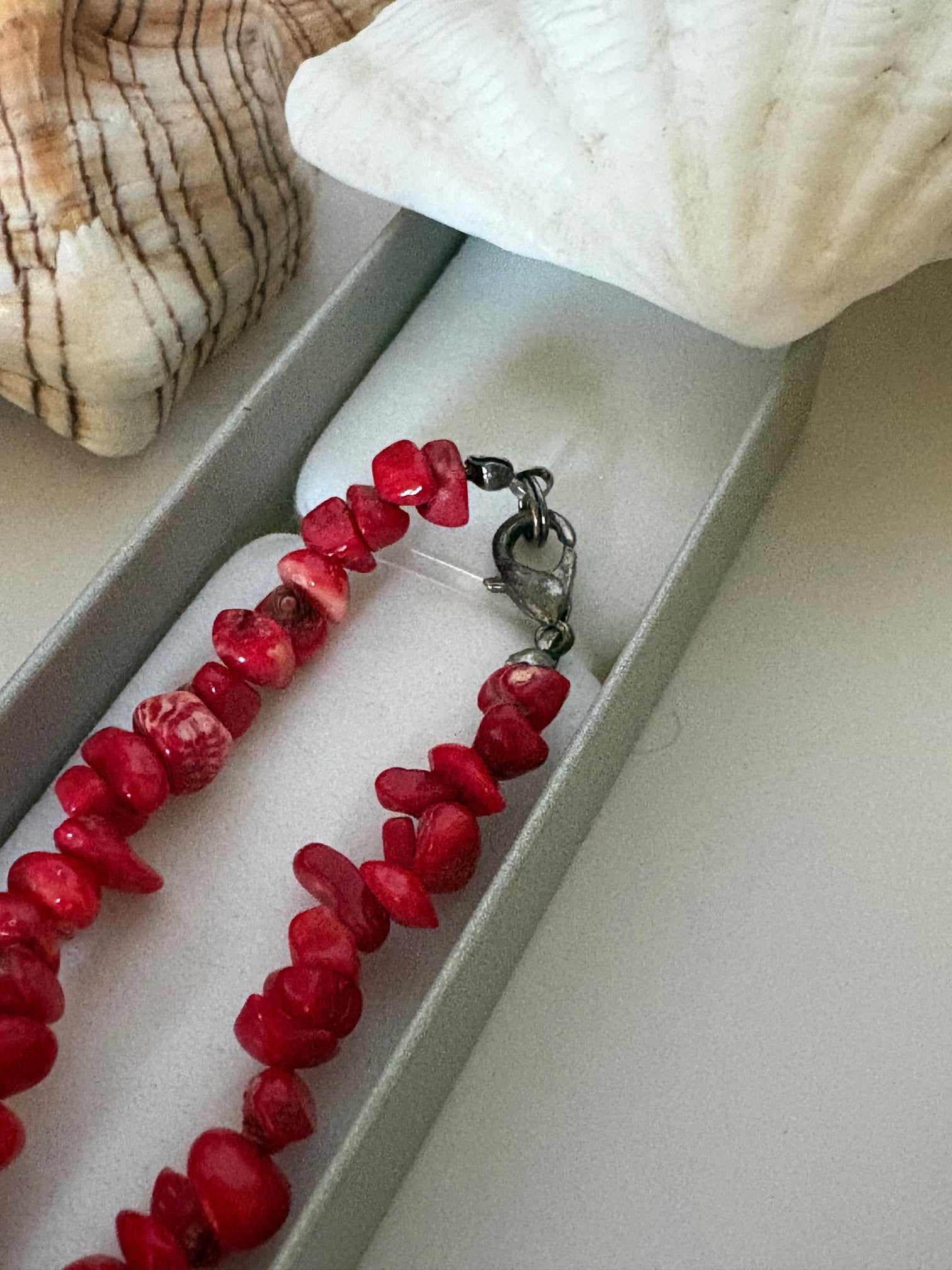 Klassische Vintage-Korallenkette in warmem Korallenrot. Zeitloses Schmuckstück mit natürlicher Ausstrahlung und klassischem Vintage-Charakter.
