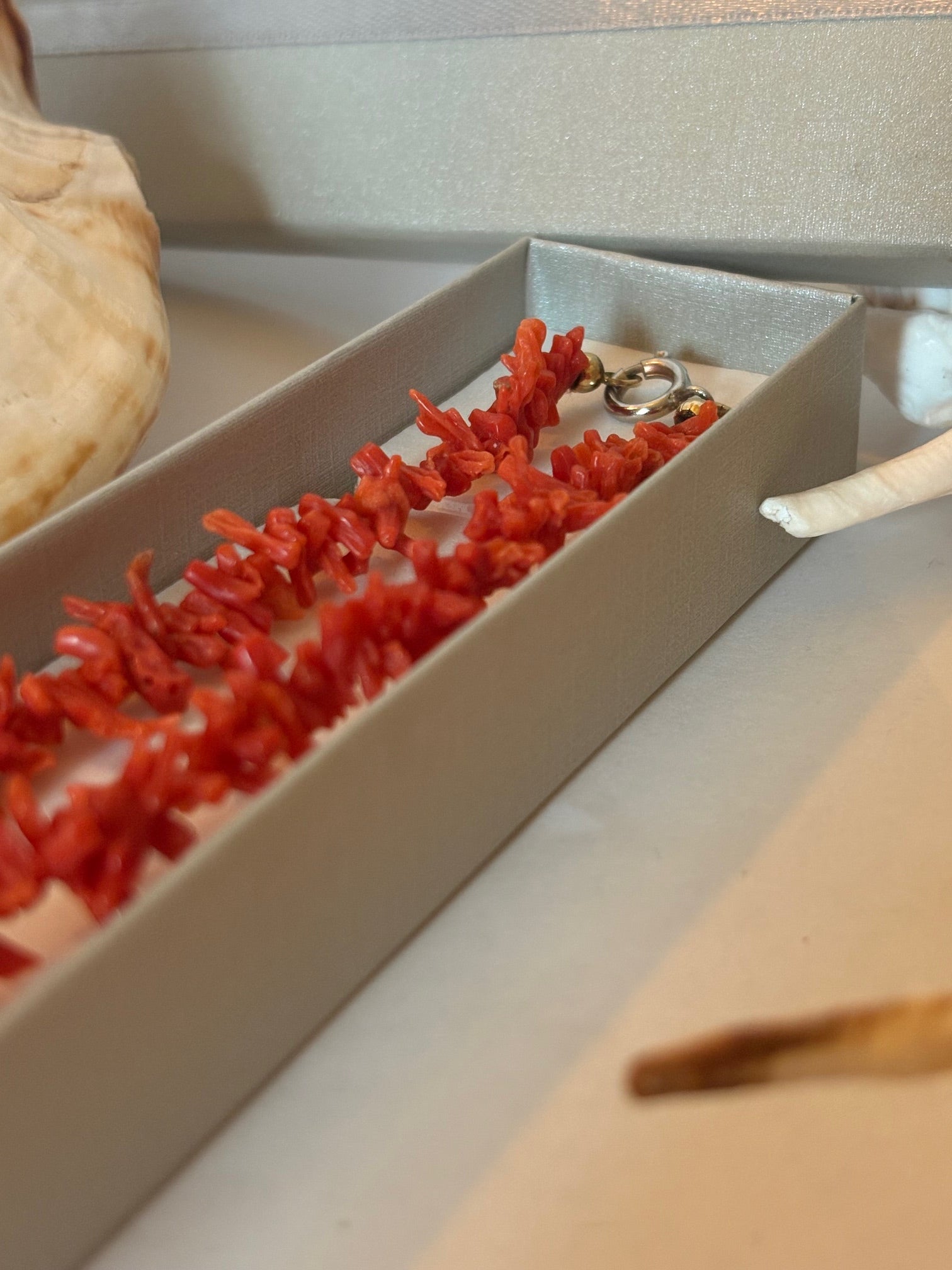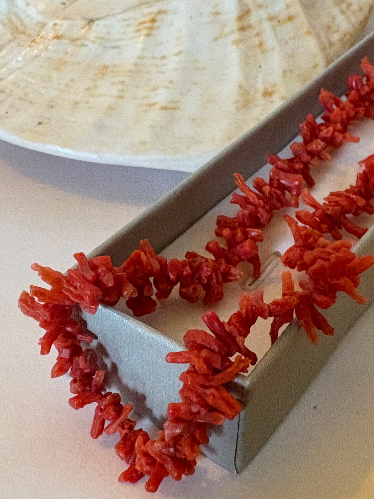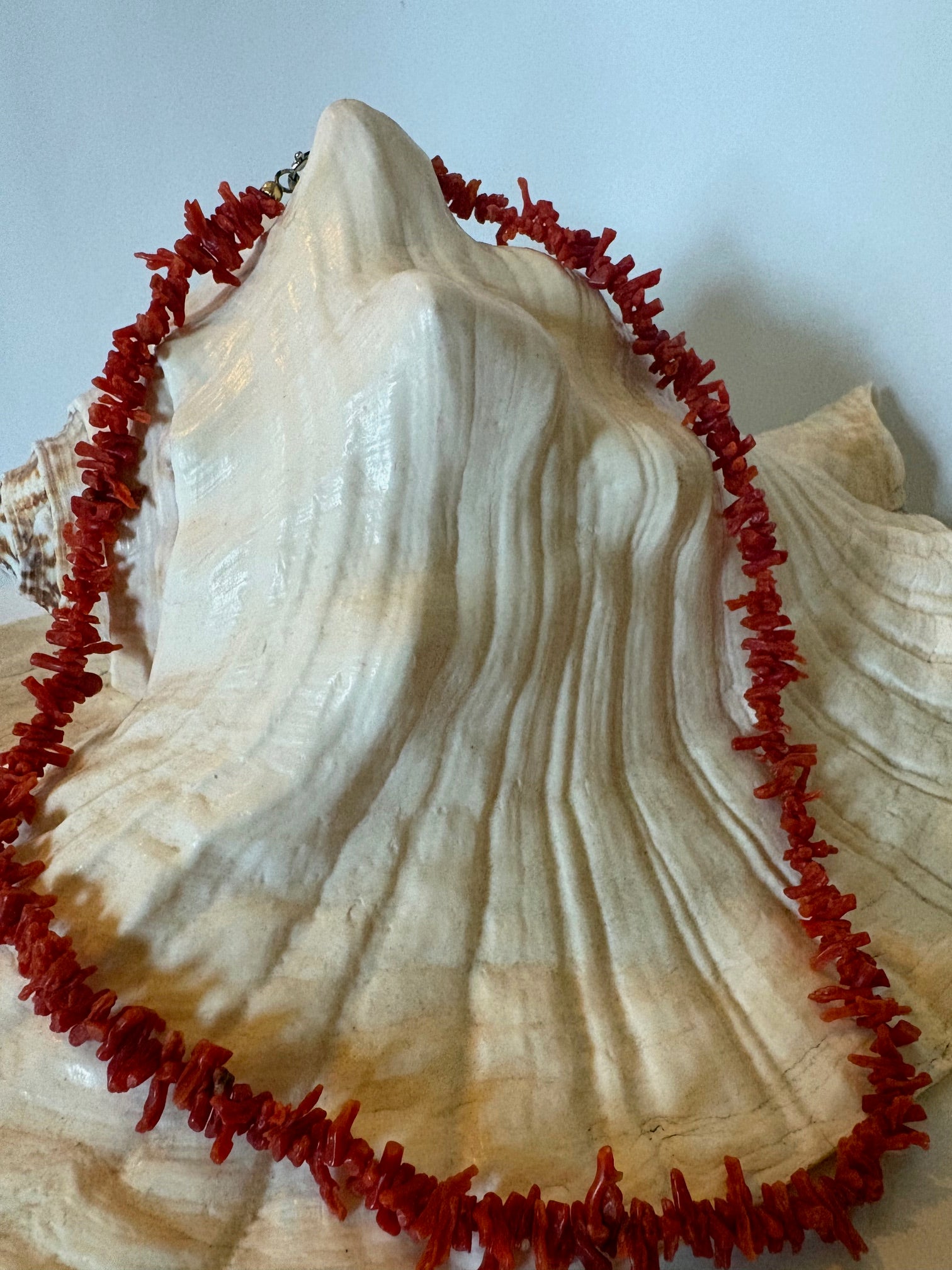 Die Kette besteht aus kleinen, unregelmäßig geformten Korallenelementen in unterschiedlichen Rotnuancen. Form, Oberfläche und Farbverteilung variieren material- und altersbedingt und verleihen dem Schmuckstück seinen charakteristischen, organischen Gesamteindruck.