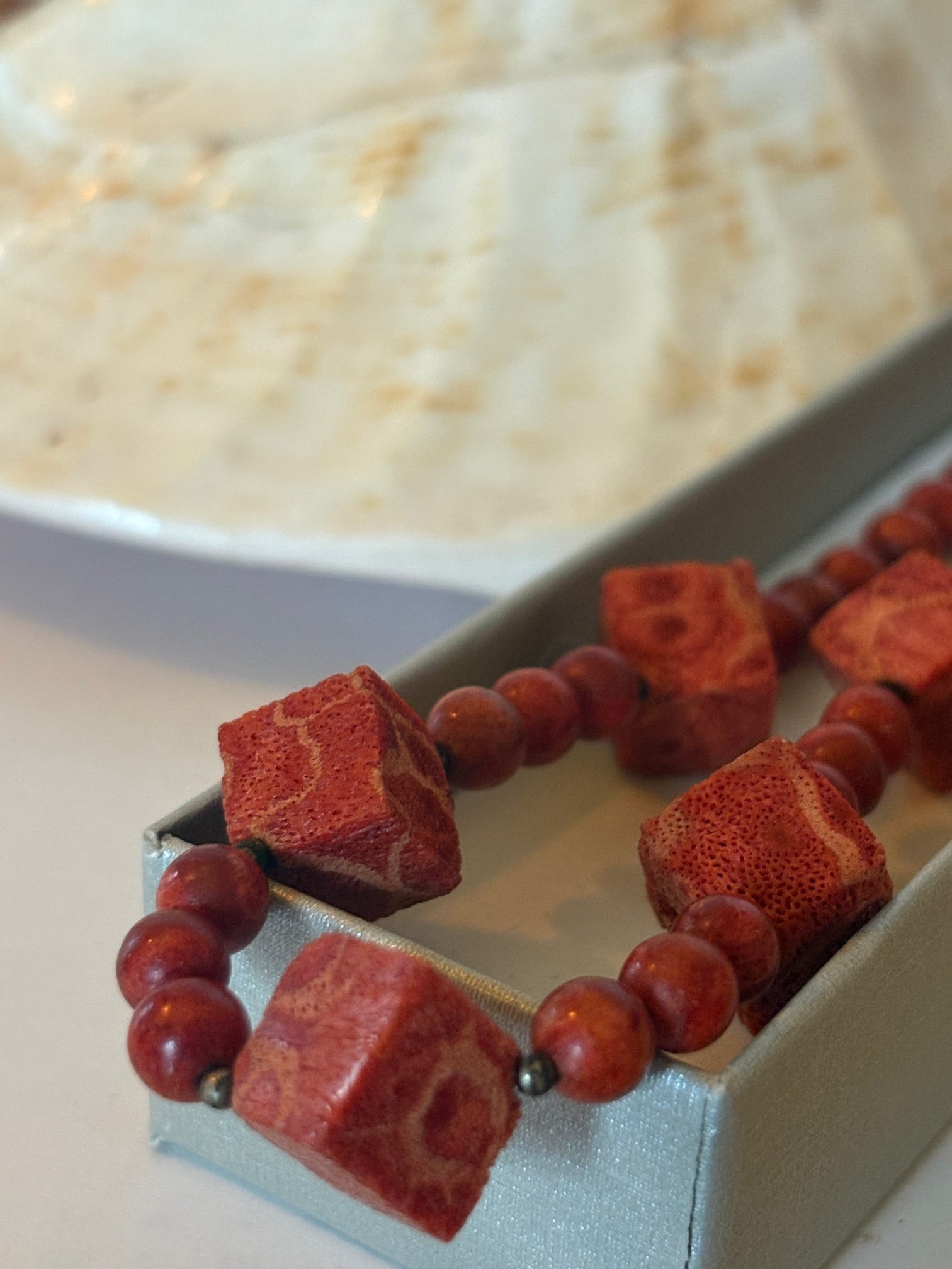Zwischen den markanten Würfeln sind kleine, rund geschliffene Korallenperlen eingefügt, die der Kette Ruhe und Rhythmus verleihen. Die matte, leicht strukturierte Oberfläche der Schaumkoralle sorgt für eine warme, erdige Ausstrahlung und unterstreicht den authentischen Charakter dieses Schmuckstücks.