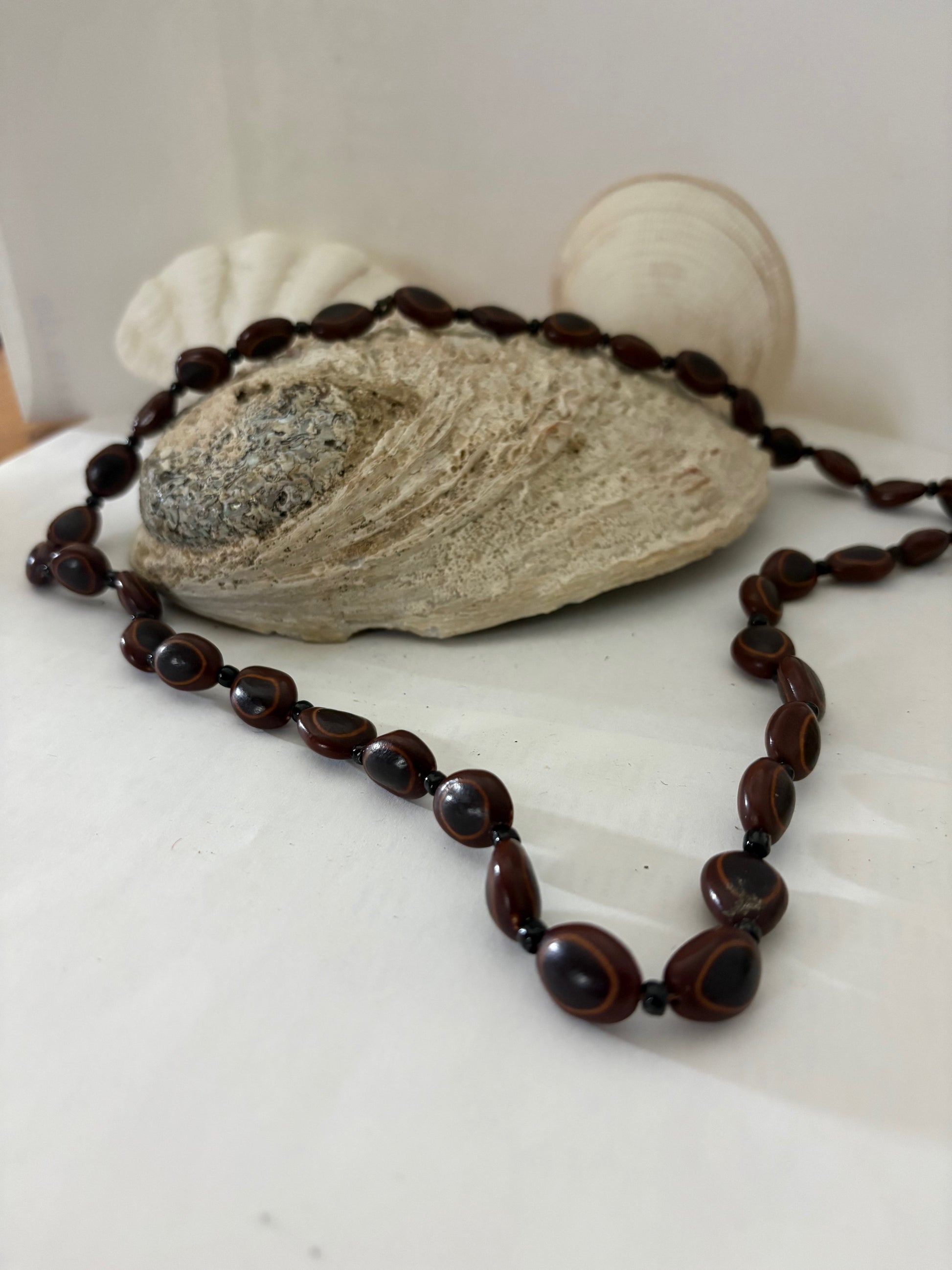 Diese besondere Vintage-Kette besteht augenscheinlich aus Samenkapsel-Perlen in warmen Brauntönen. Die ovalen Elemente zeigen eine natürliche, kontrastreiche Zeichnung mit dunkler Mitte und hellerem Rand – ein charakteristisches Merkmal organischer Naturmaterialien.