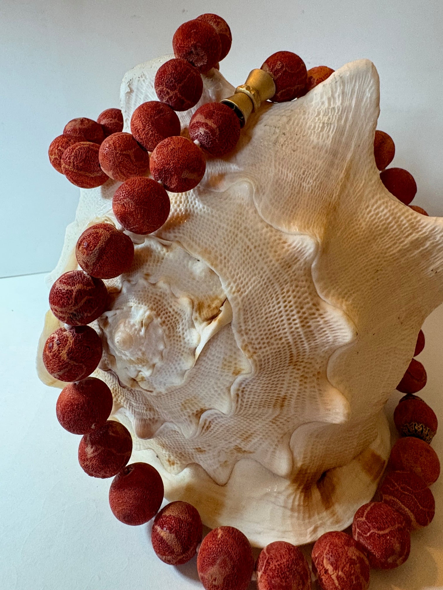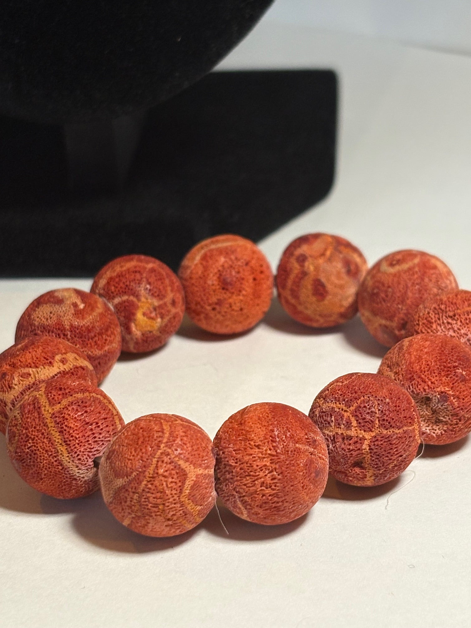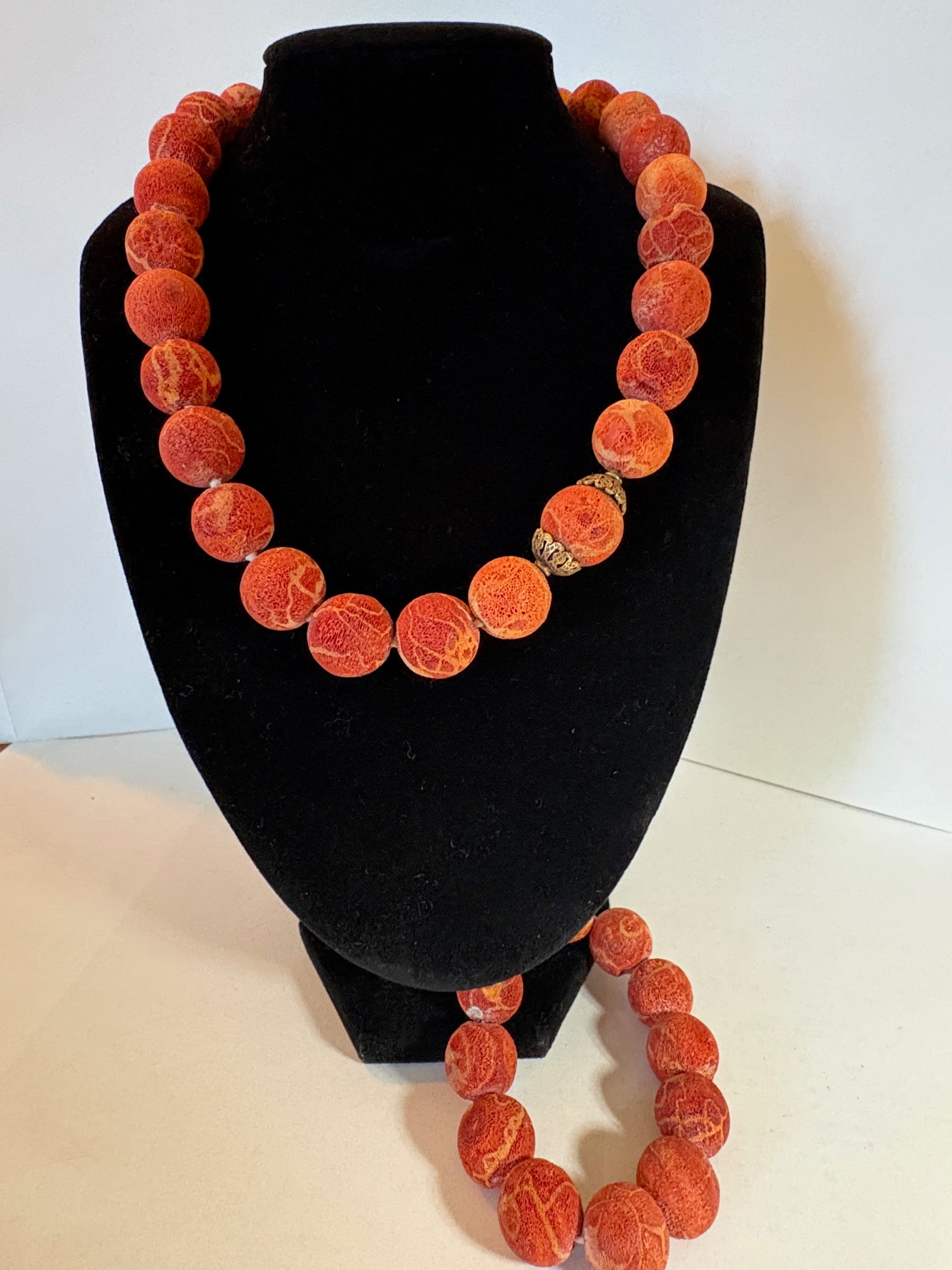 Dieses Vintage-Schmuckset kombiniert eine ausdrucksstarke Halskette mit einem passenden elastischen Armband, beide gefertigt aus Schaumkorallen-Elementen in warmen Rot- und Naturtönen. Die Farbnuancen und die organische Kugelform verleihen dem Set eine natürliche, lebendige Ausstrahlung mit klassischem Charakter.