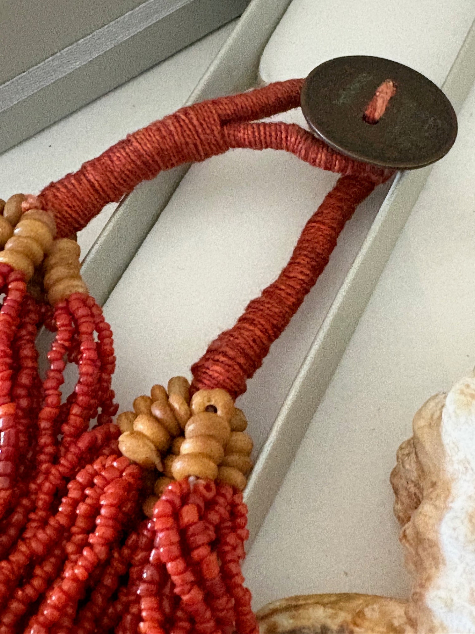Ausdrucksstarke Vintage-Perlenkette im ethnisch inspirierten Stil mit warmen Rottönen – kraftvolles Statement-Collier mit markanter Präsenz.