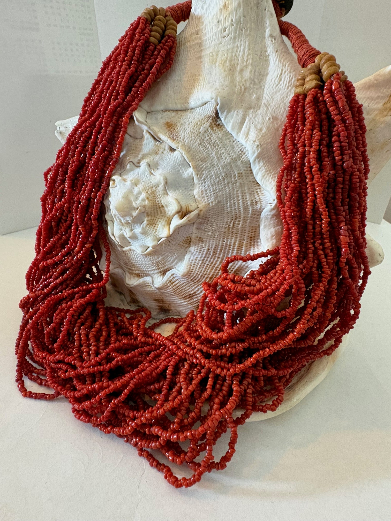 Diese markante Vintage-Perlenkette im ethnisch inspirierten Stil besticht durch ihre kräftigen, warmen Rottöne und ihre ausdrucksstarke Formgebung. Die Gestaltung erinnert stilistisch an traditionelle Schmuckästhetiken und verleiht dem Collier eine kraftvolle, charakterstarke Wirkung.